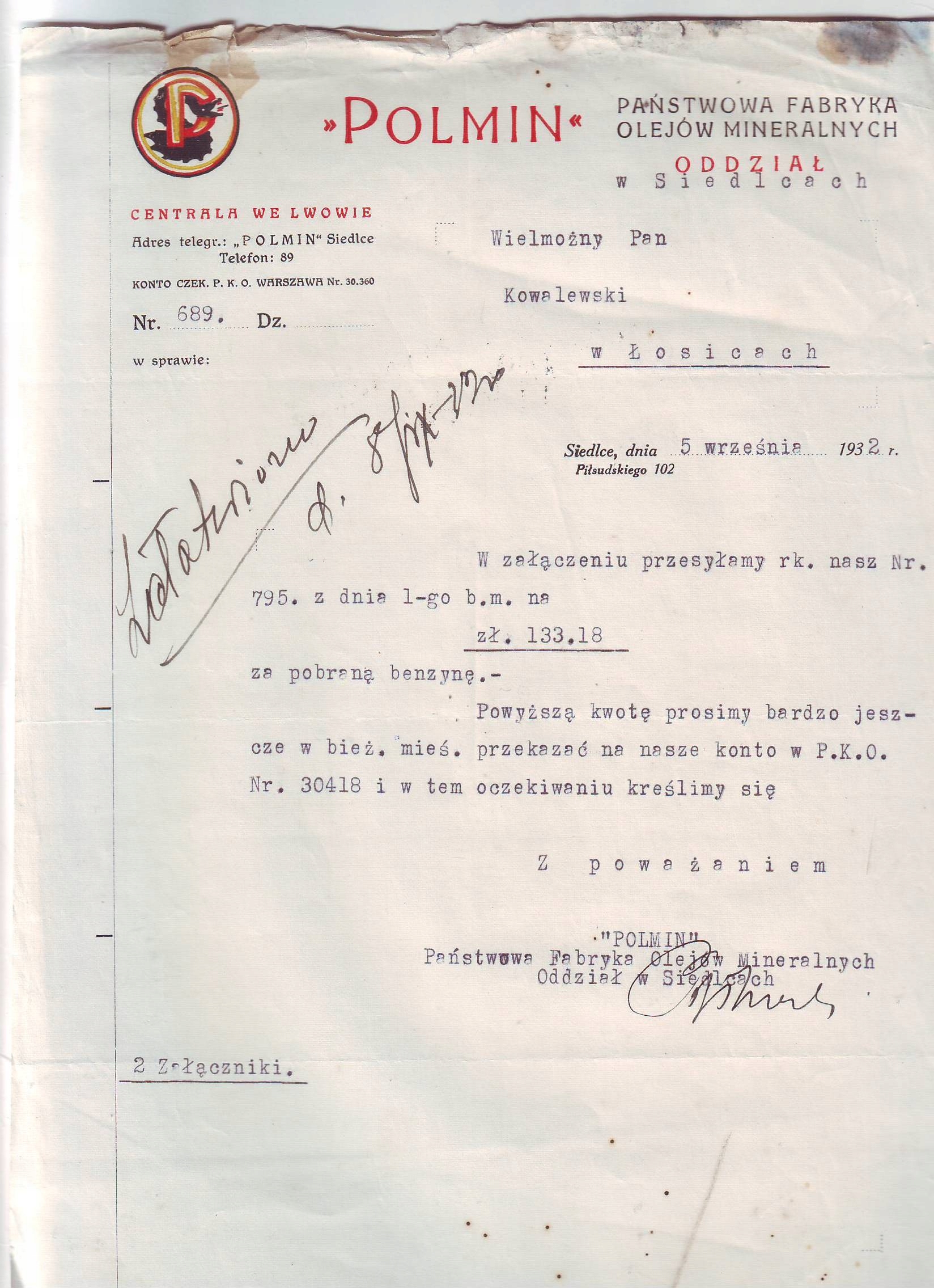ПОЛМИН на товарной накладной на бензин, 1932 год, филиал в Седльце.