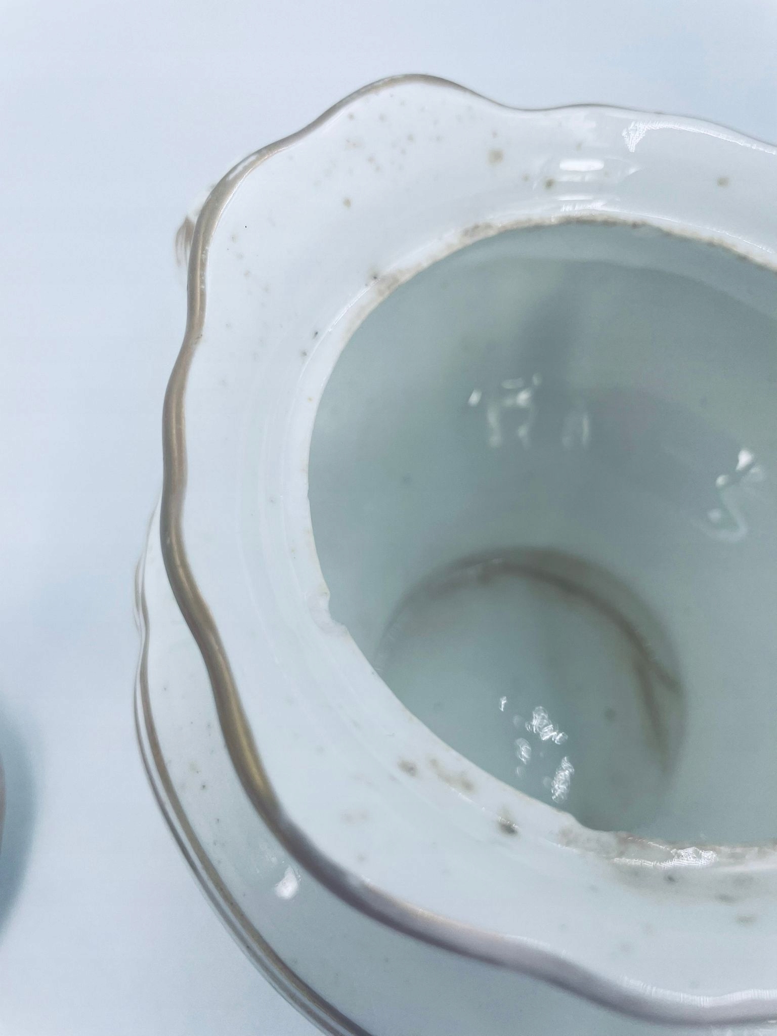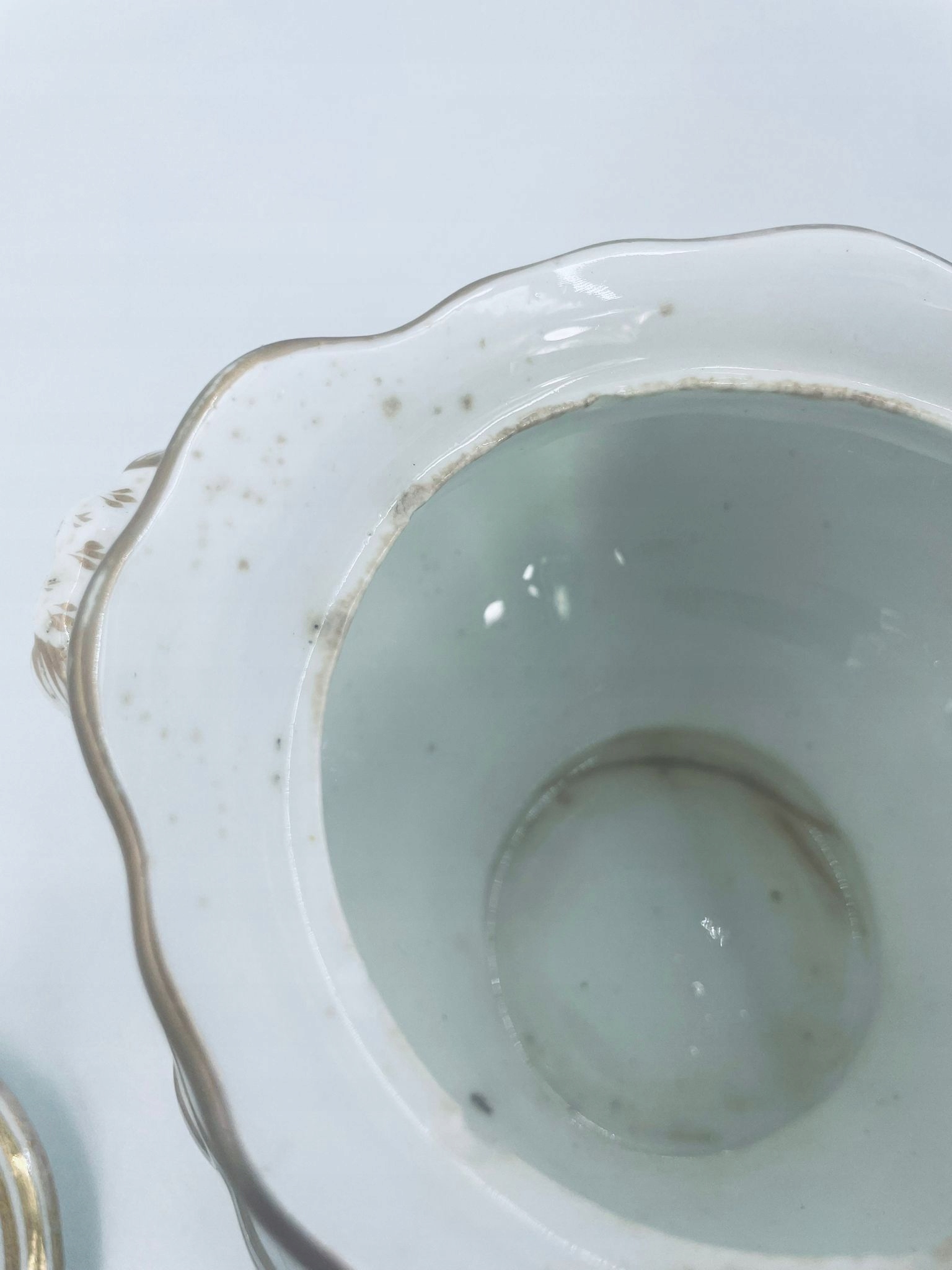 конфеты из деликатного костяного фарфора в Экру. Это характеризуется декоративными элементами, золотыми полосами. У него есть стилизованные листья на верхней части и узоры на ручках, а также декоративная основа и крышка. Обесцвеченный кондитер, имеет тонкий ущерб немного видимым.