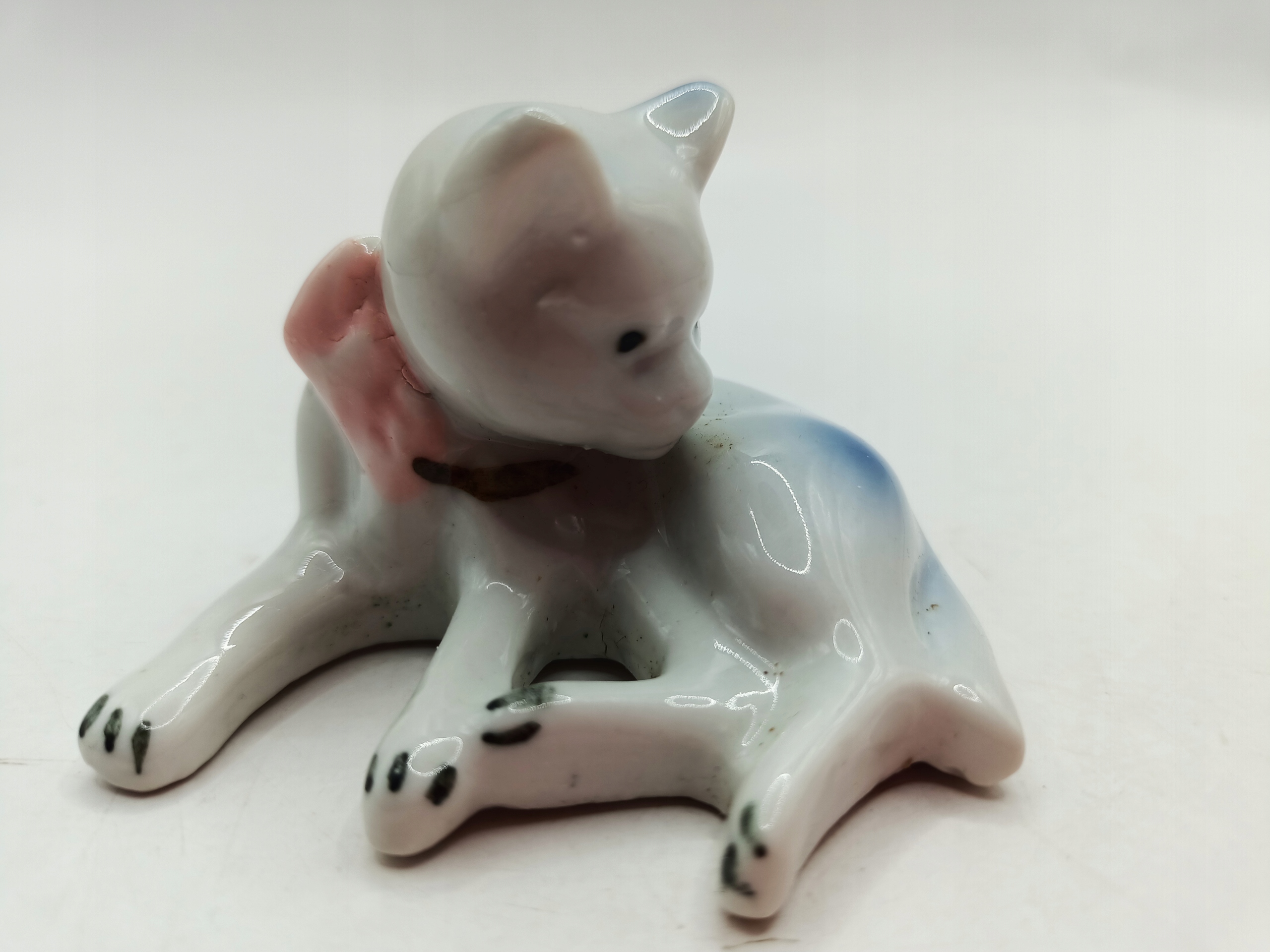 Фарфоровая фигурная кошка кошка маленькая с луком и синим цветом