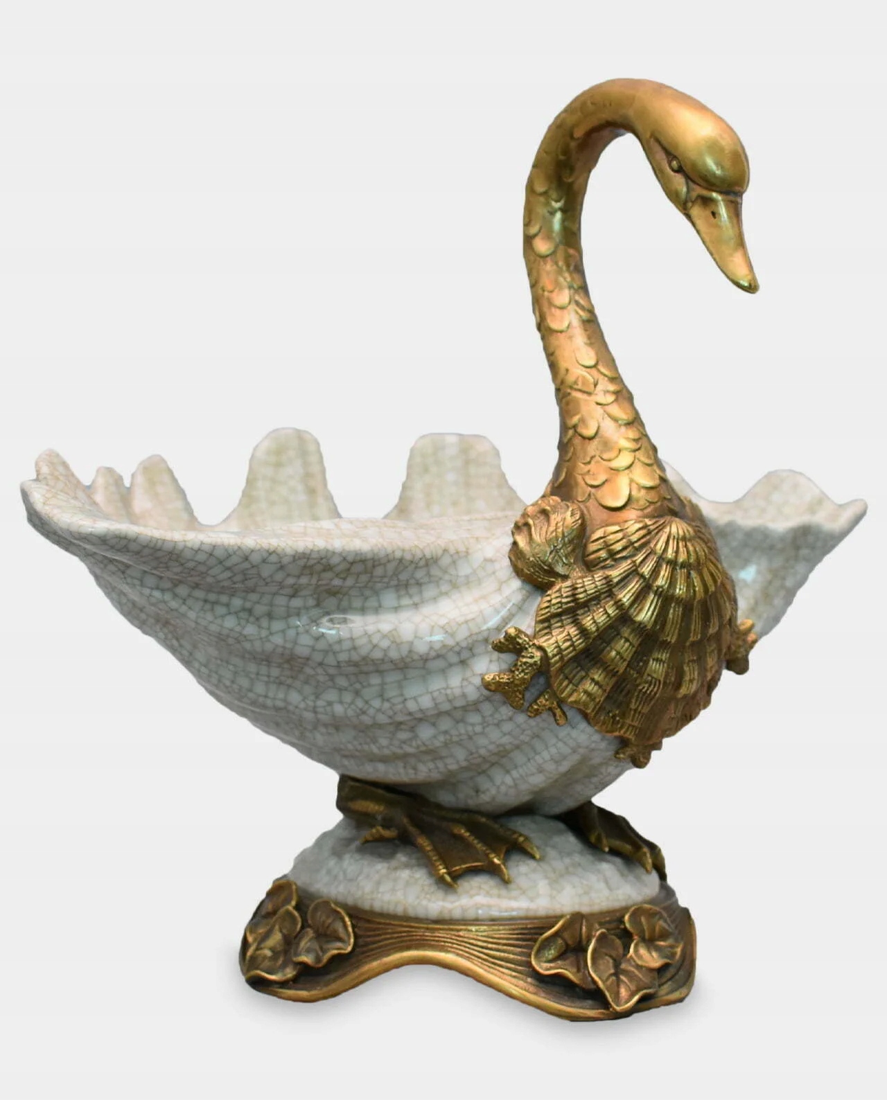 Фарфоровая миска с лебедей в форме бронзы. Красивый, ручной. Основание, голова и бронзовые лебедь ноги. Изготовлен из эксклюзивных материалов - фарфорового и бронзы, очень точно, с вниманием к наименьшим деталям. Это производит огромное эстетическое впечатление и имеет вечный стиль. Подходит много интерьеров.
