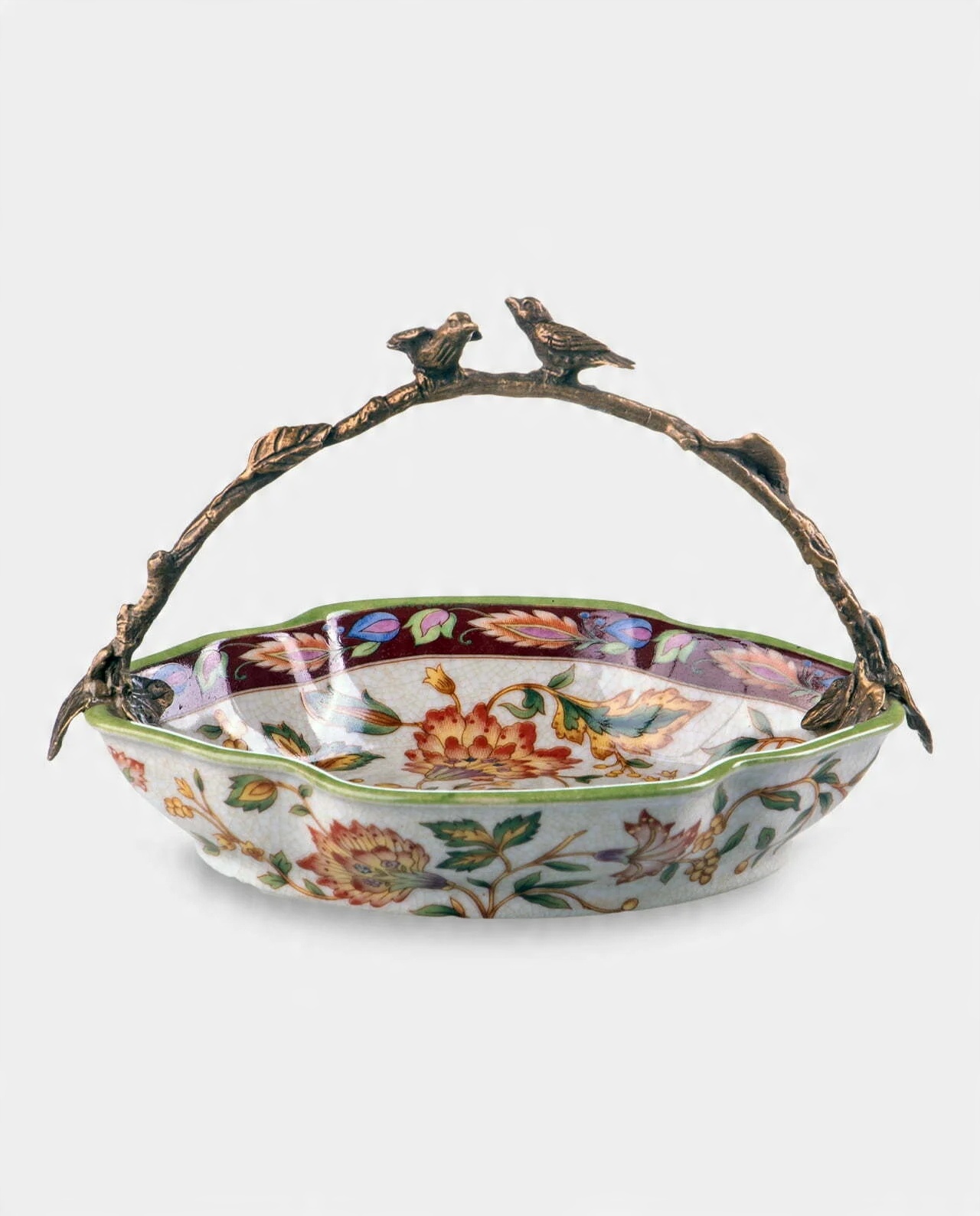 Красивая чаша в форме корзины из фарфора с бронзовой фурнитурой. Фарфор, расписанный вручную растительным орнаментом. Ручка с птицами из бронзы. Этот декоративный сосуд изготовлен из эксклюзивных материалов очень точно, с вниманием к мельчайшим деталям. Он производит большое эстетическое впечатление и имеет вневременной стиль. Подходит ко многим интерьерам.