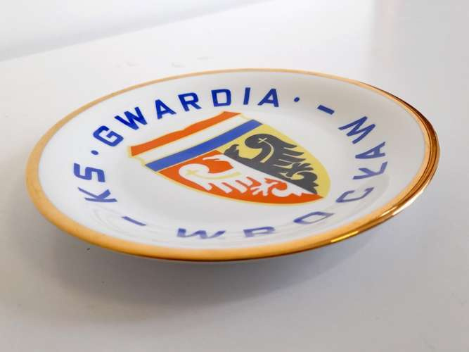Описание: Официальная, памятная фарфоровая пластина, опубликованная во время польской Народной Республики Гарвардией Вроцлавский спортивный клуб. Он показывает нарисованное название и герб клуба и герб города Вроцлав. Пластина была произведена фарфоровой фабрикой Вавеля от Валбриха. На другой странице есть заводская подпись.