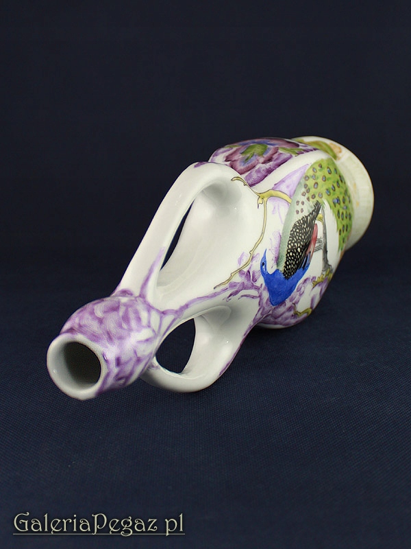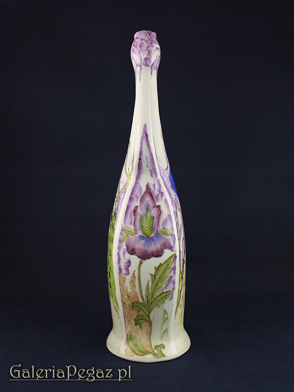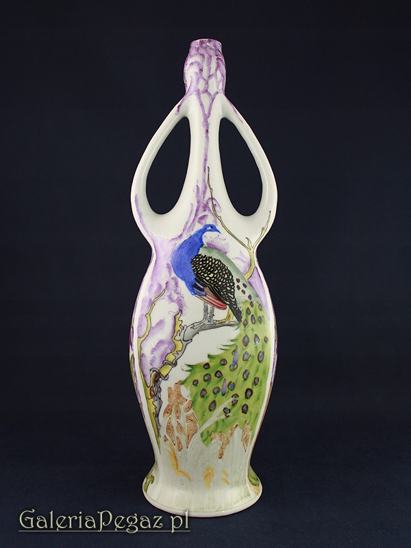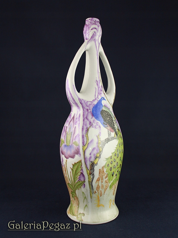 Ваза украшена анималистическим орнаментом в виде сидящего на ветке павлина (популярный декоративный мотив периода модерна) и цветка ириса.