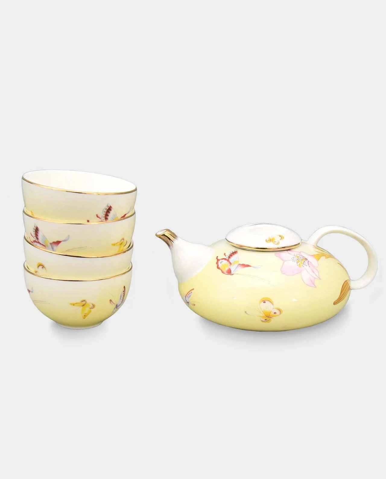 Фарфоровый чайный сервиз на 4 персоны, состоящий всего из 5 элементов. Красивый, минималистичный, украшенный золотой полосой и нежным мотивом бабочек и цветов, выполненный по образцу японского стиля. Изготовлен из эксклюзивного материала очень точно, с вниманием к мельчайшим деталям. Он производит большое эстетическое впечатление и имеет вневременной стиль. Подходит для многих интерьеров.