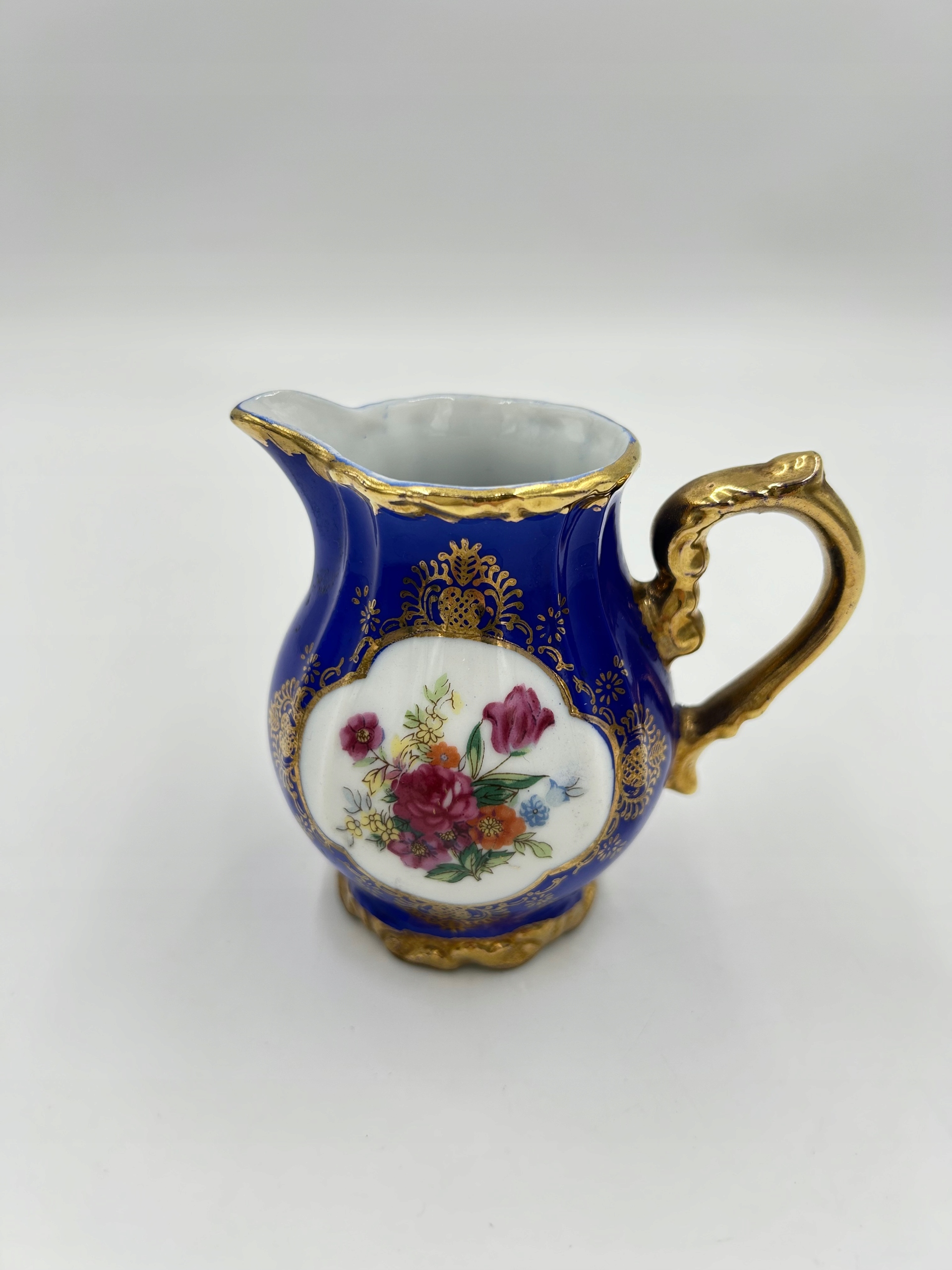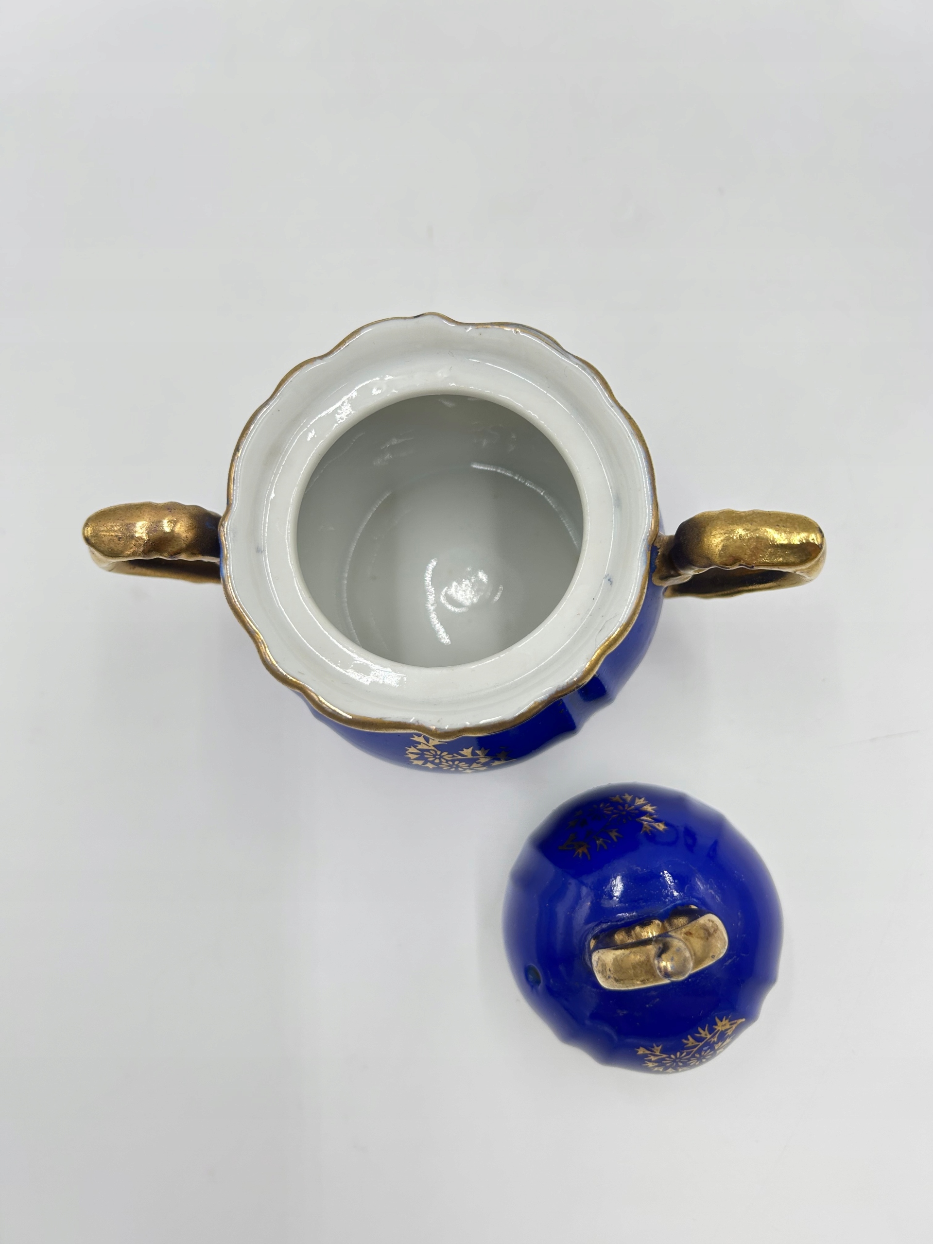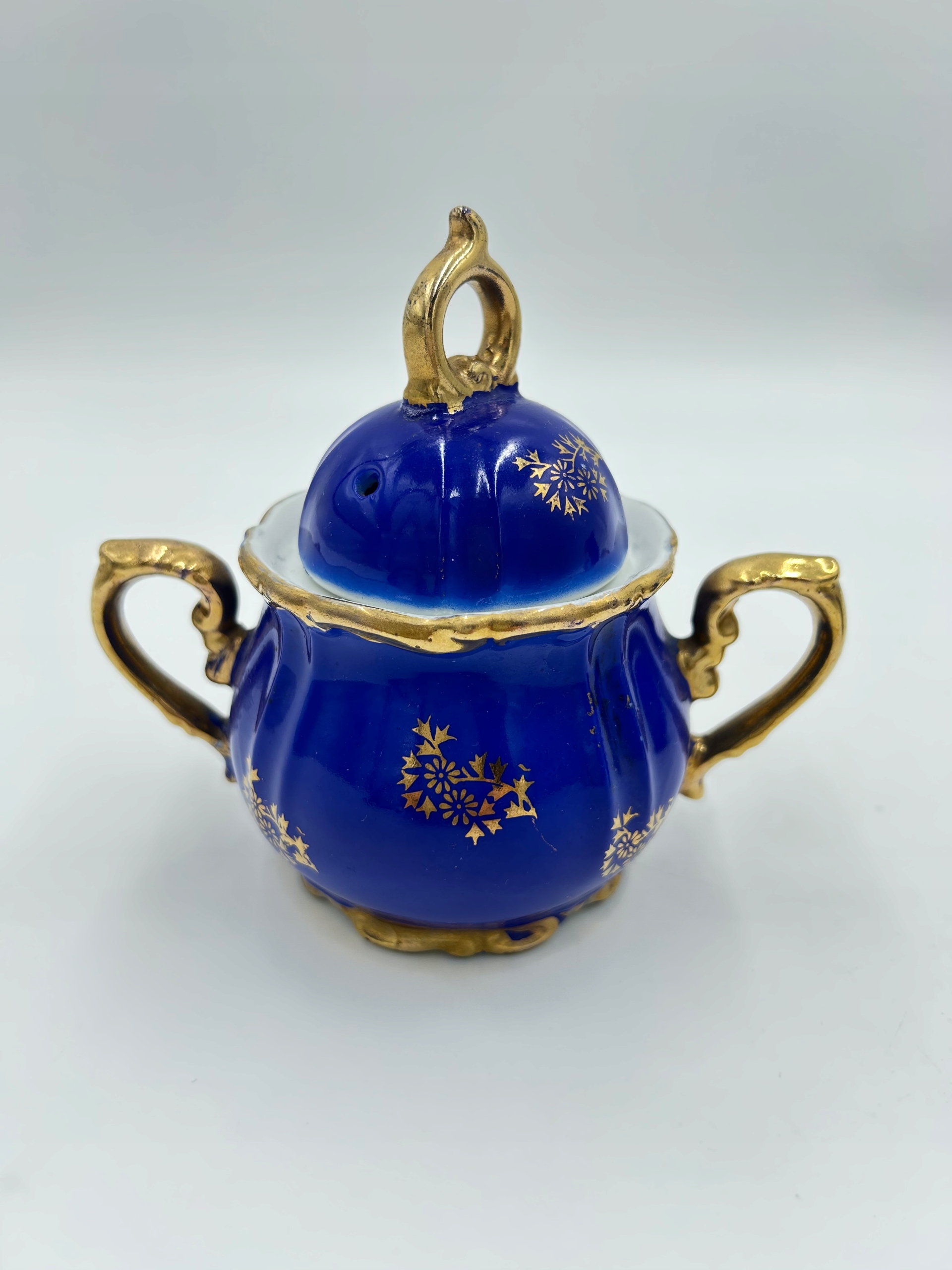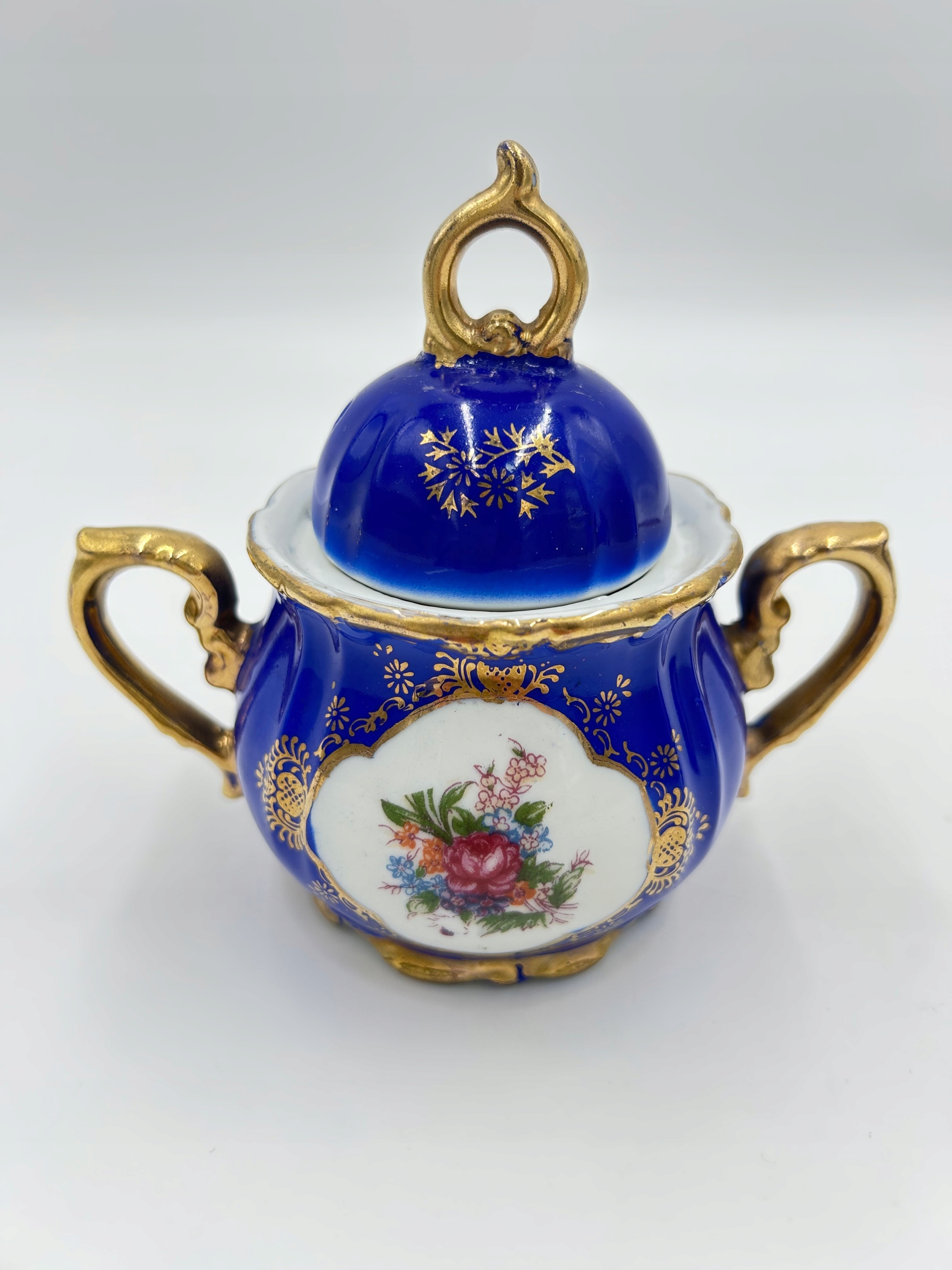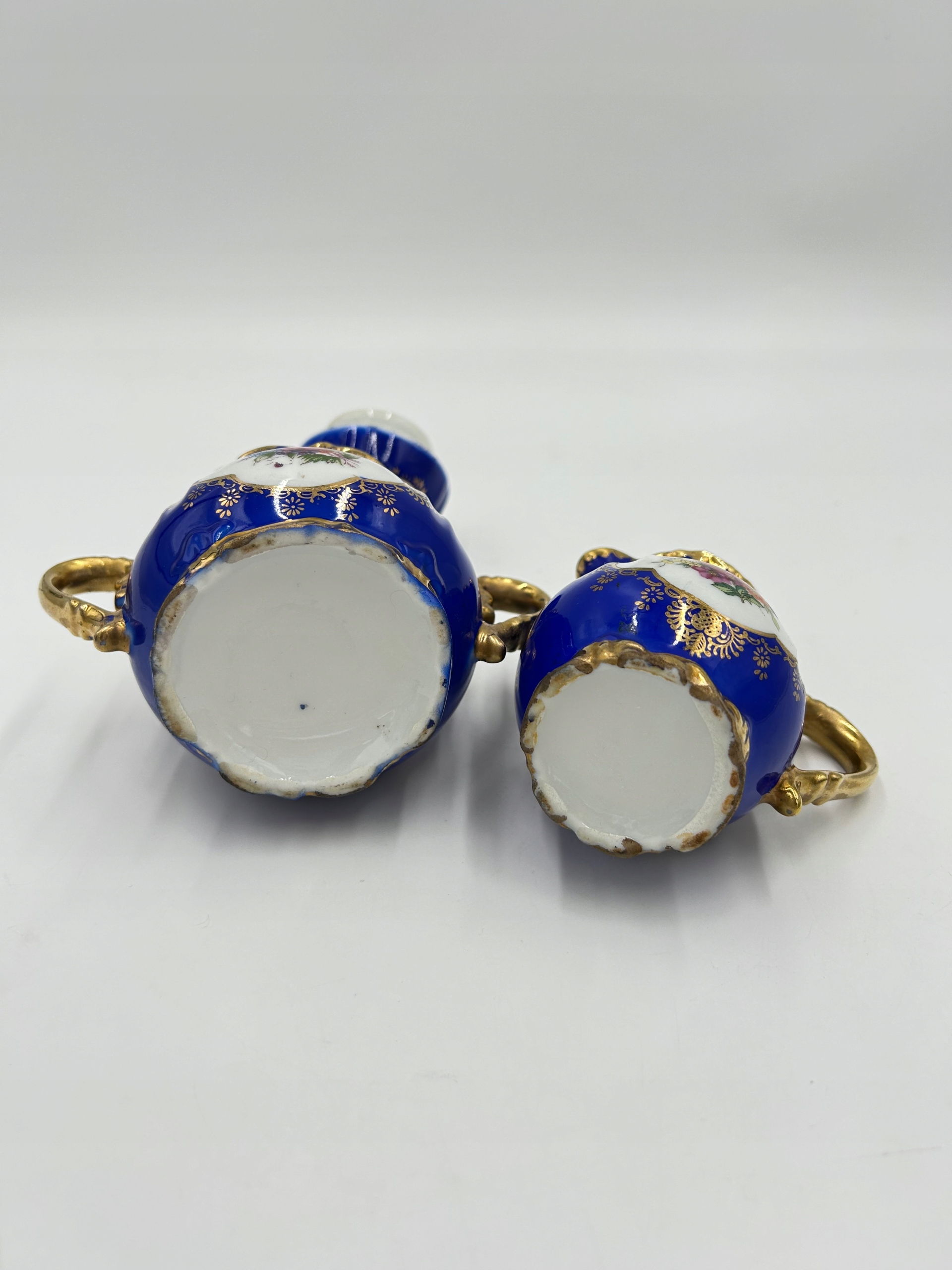 Предмет продажи — очаровательный комплект из сахарницы и молочника. Богатый декор с цветочным мотивом, позолоченные края и насыщенный синий цвет подчеркивают их уникальность.