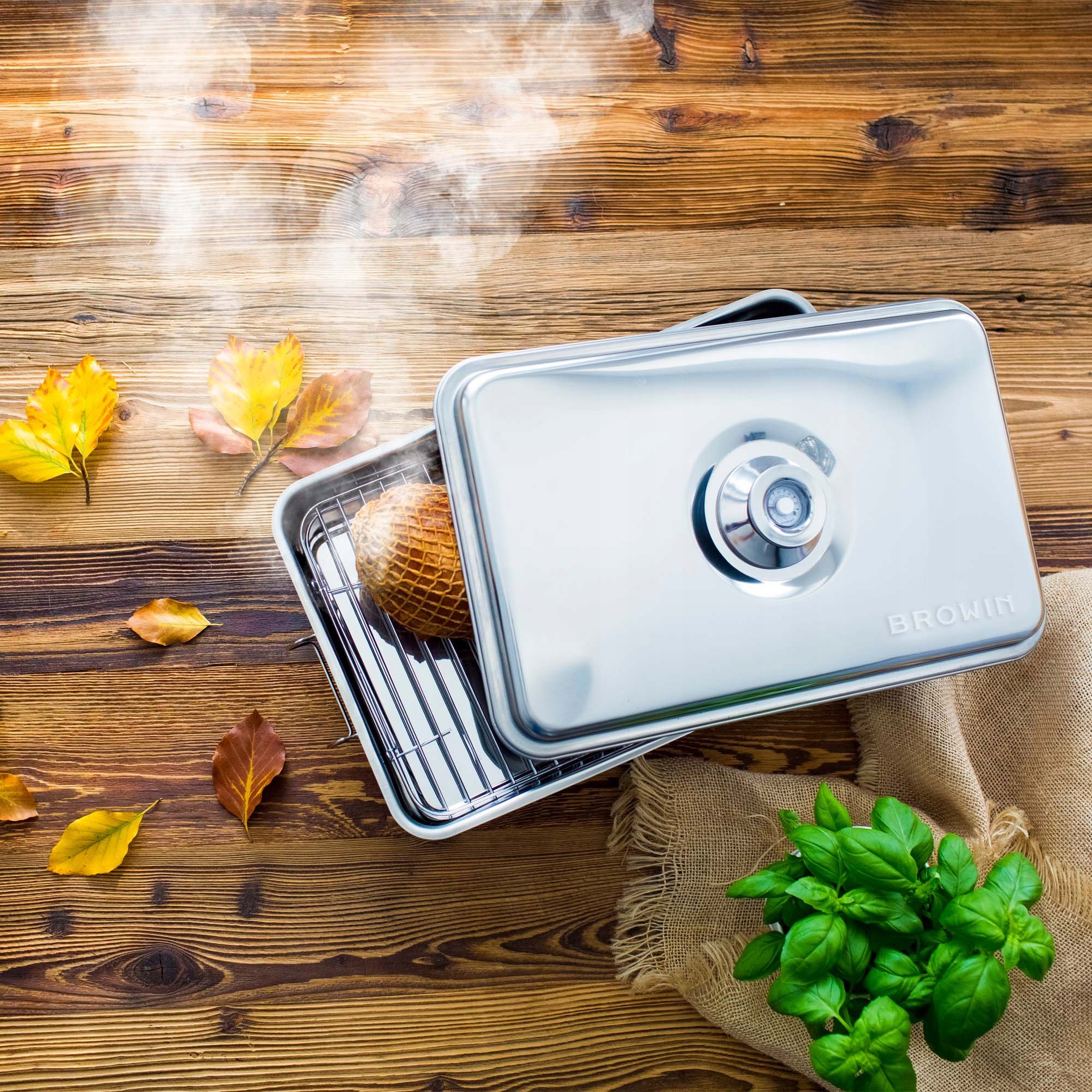 Он изготовлен из высококачественной нержавеющей стали и позволяет коптить мясо, рыбу, сыр, яйца и колбасы. Благодаря небольшому размеру он что вы можете использовать его как на балконе, террасе, в саду, так и во время путешествия, например, в походе или кемпинге. Коптильня позволит закоптить до 4-х форелей одновременно. Благодаря прочной и продуманной конструкции изделие чрезвычайно долговечно и его легко содержать в чистоте.