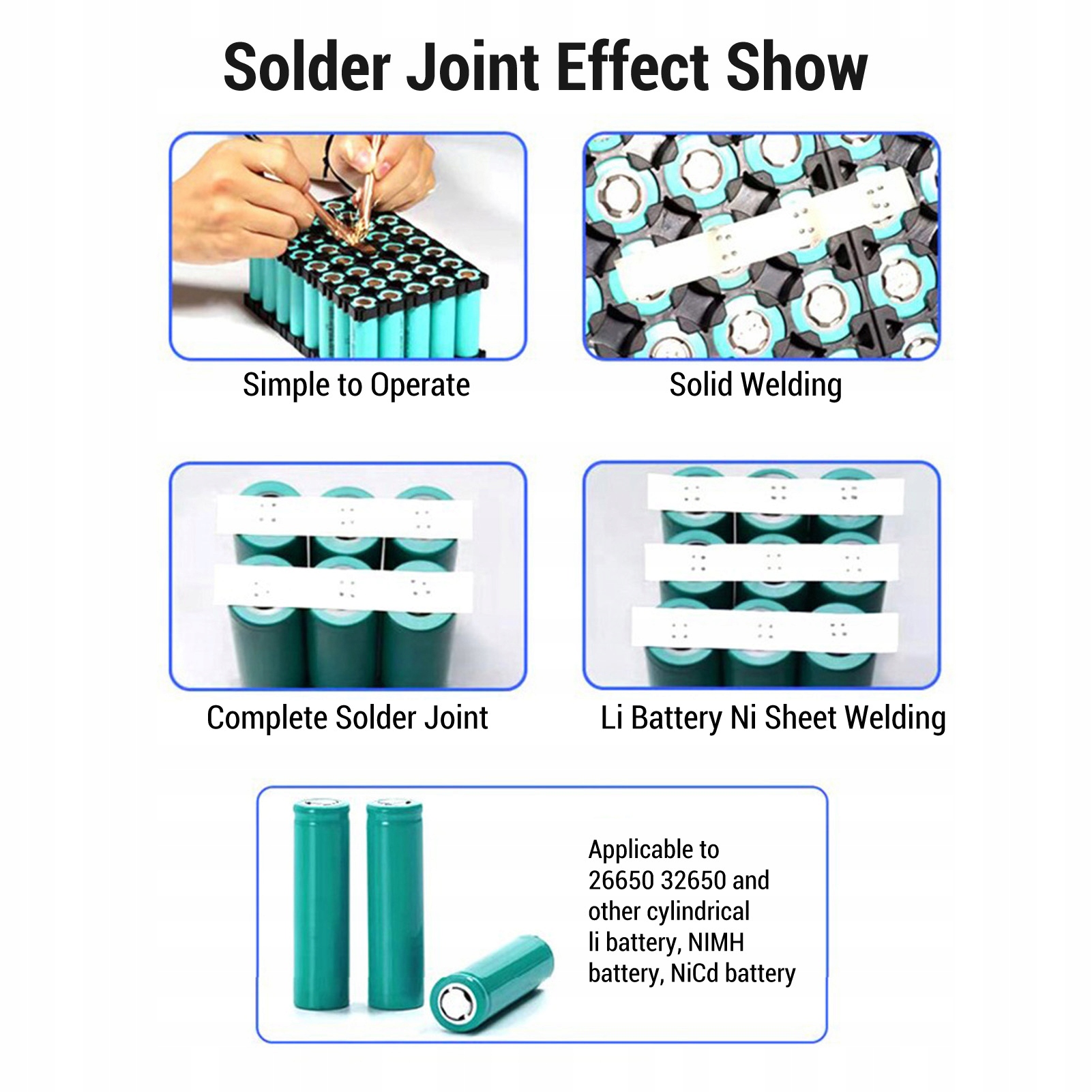 5. Безопасно и интеллектуально: эта ручная сварочная машина имеет низкое напряжение, чрезмерный ток и переполненное покрытие, с низкой функцией предупреждения о батареи, интеллектуального выходного тока, обеспечения безопасности и надежности. 32650 и другая цилиндрическая батарея LI, батарея NIMH, батарея NICD и т. Д., Предоставляя сварку твердое вещество, имеет широкий спектр применений