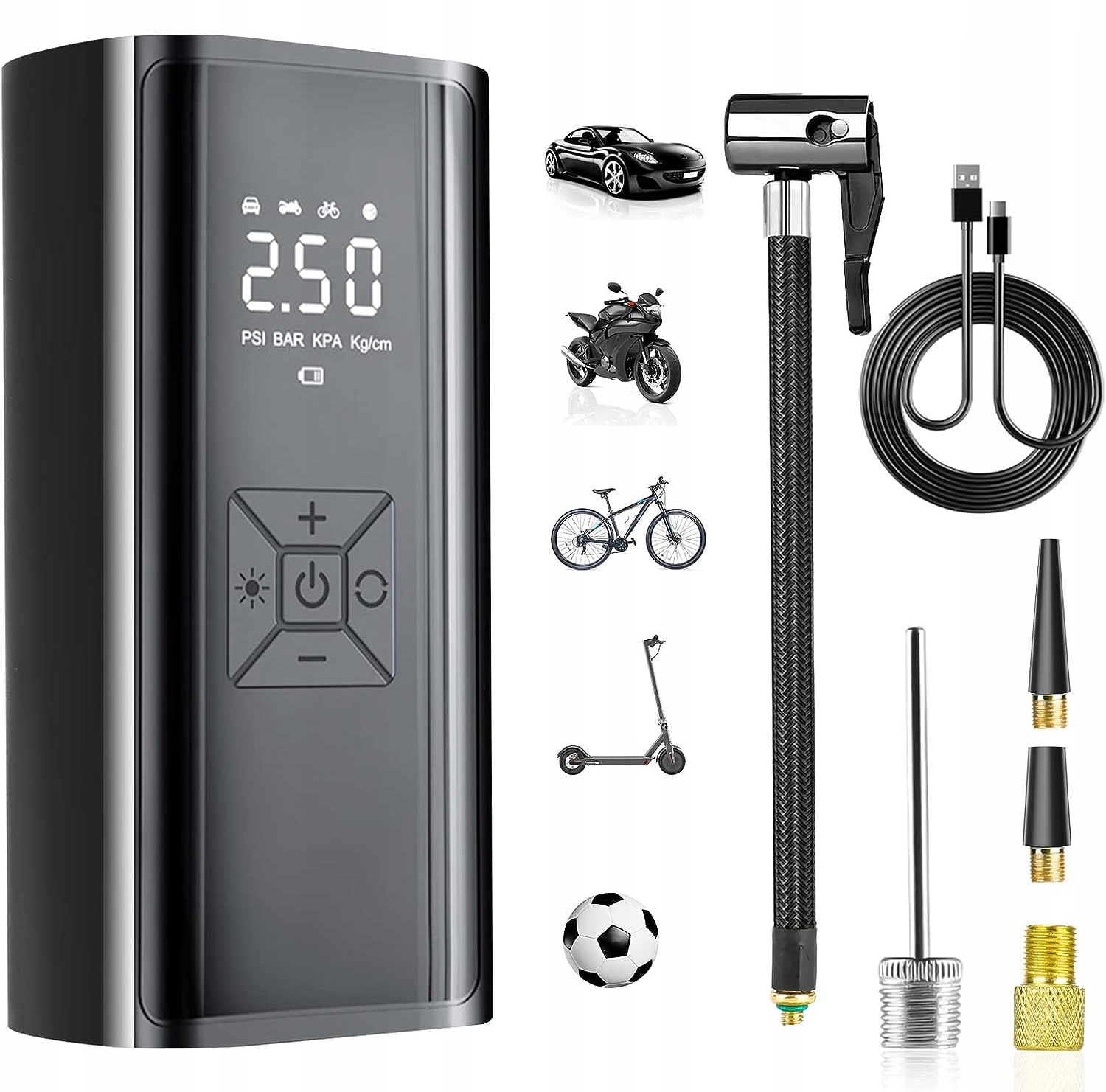 ✅ Предварительное давление шин и автоматическую остановку: Вы можете проверить и заранее установить необходимое давление в шинах. Электрический воздушный насос воздушного компрессора автоматически останавливается после достижения давления до расстановки. Вам не нужно беспокоиться о перекачке. (Нажмите и удерживайте кнопку «Пуск», чтобы предварительно установить давление в шинах, а затем кратко нажмите кнопку «Пуск», чтобы запустить накачать) Значение можно проверить на экране. Если у устройства мало электричества. Продукт должен быть заряжен своевременно, чтобы избежать слабых или разряженных батарей. После каждого использования рекомендуется ждать не менее 15 минут, чтобы остыть, прежде чем использование будет продолжено.