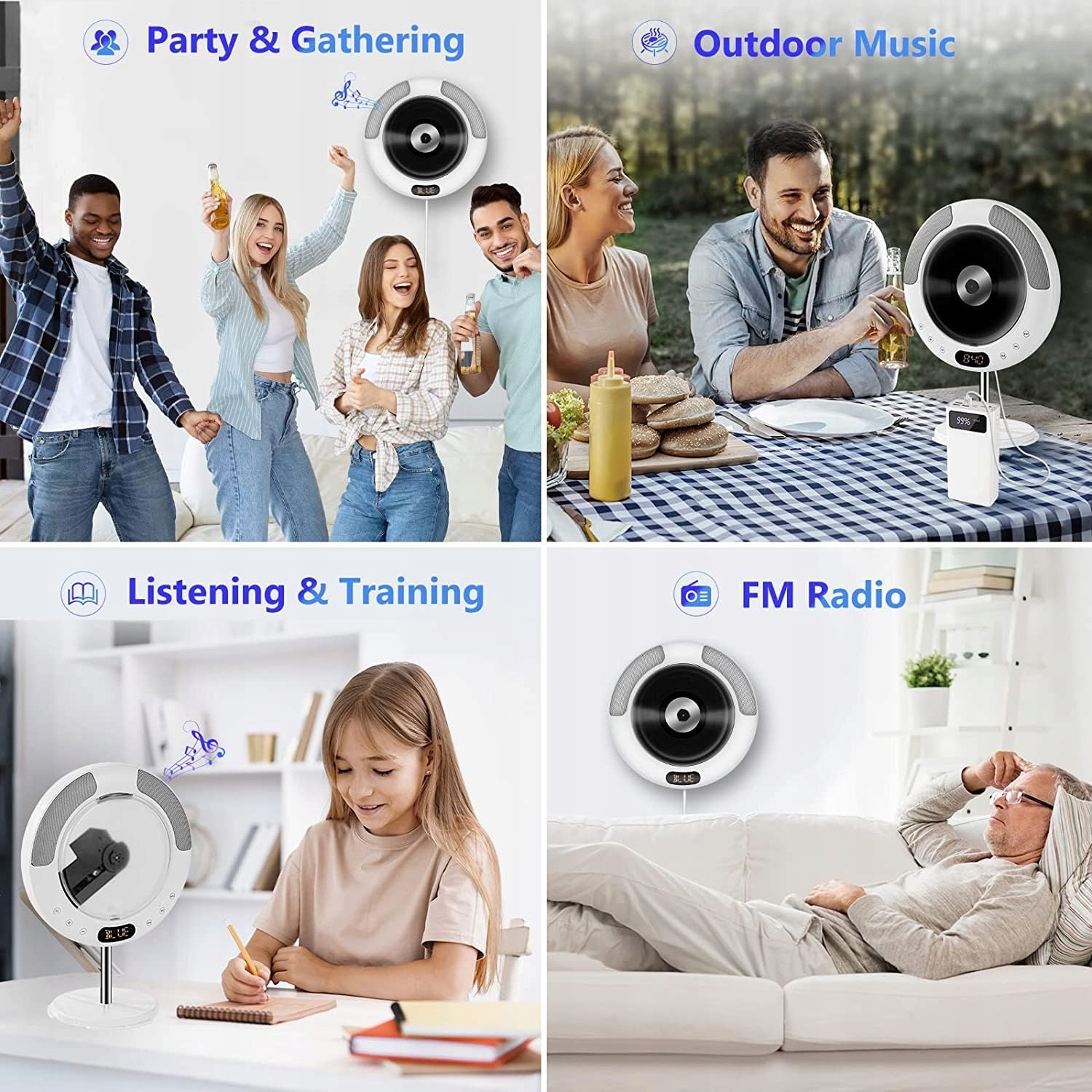 Этот CD-плеер можно использовать в качестве портативного музыкального игрока, FM-радио, динамика Hi-Fi Bluetooth, домашний стерео/ бумбокс, USB-плеера, инструменты обучения и широкооцененные соответствия CD-R, CD-RW, MPMA, WMA и CD-G-форматы, плавно репрессируют все типы CD. Его можно использовать в различных ситуациях, таких как партия, обучение, массаж, йога и домашнее образование.