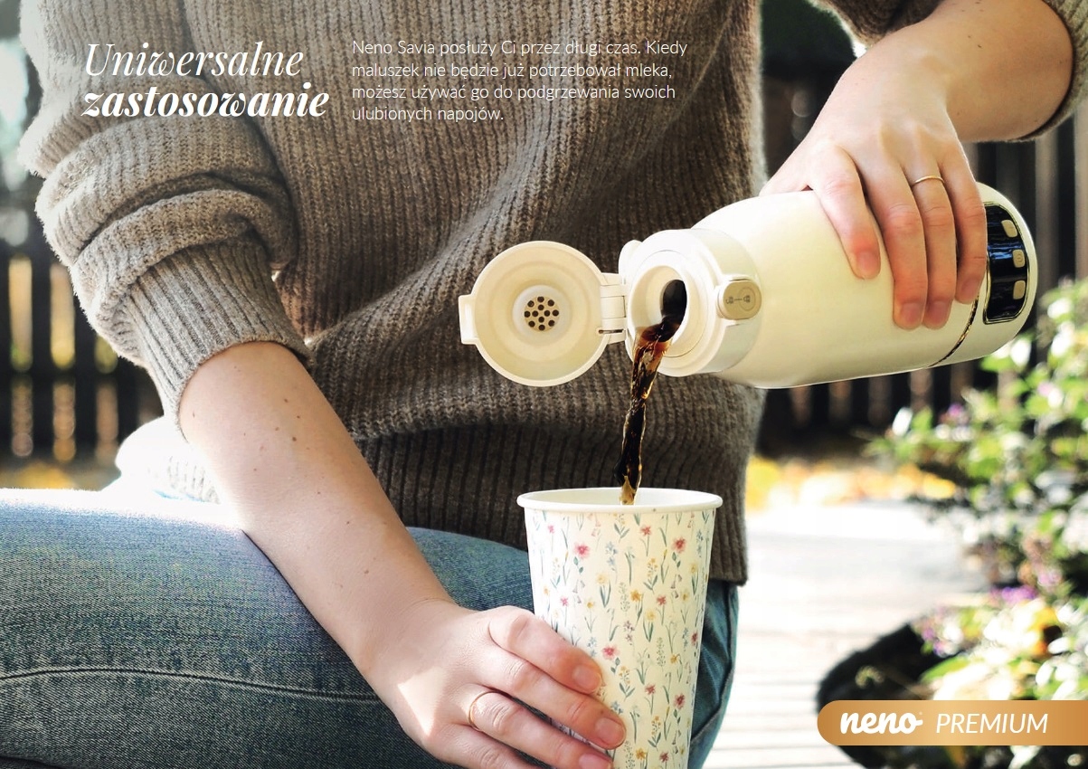 Neno Savia - это беспроводной нагреватель, который идеально подходит для путешествий и во время повседневных выходов. Он быстро нагревает молоко или воду, поддерживая их температуру, а одна зарядка позволяет нагревать жидкости восемь раз. Благодаря легкой, компактной конструкции, удобной ручке и плотному закрытию вы можете взять ее везде.