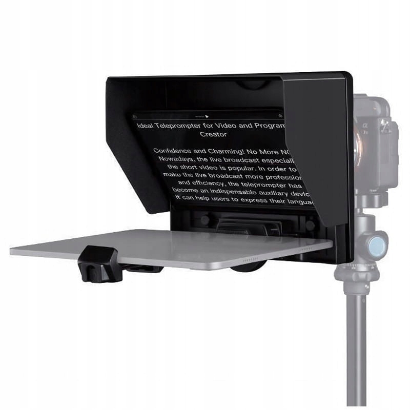 Feelworld TP10 — это портативный складной телесуфлер, предназначенный для отображения текста с телефона или планшета и захвата изображений с помощью камеры или второго смартфона. Устройство легко установить и использовать – его можно использовать как в домашних, так и в профессиональных студиях звукозаписи. Диагональ стеклянной поверхности, на которой отображается текст, составляет до 21 см, поэтому суфлером можно пользоваться даже стоя на большем расстоянии. Стекло работает по принципу одностороннего зеркала. Текст виден только с одной стороны и не фиксируется камерой. Исполнитель постоянно находится в зрительном контакте со зрителем, бегло говорит и ему не нужно смотреть в записи.