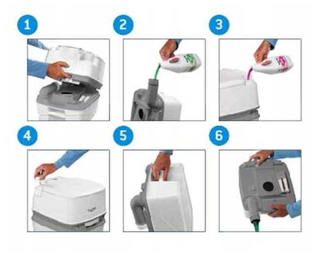 2. Добавление соответствующих препаратов в нижний резервуар (для фекалий) облегчает опустошение туалета, растворяет контент, устраняет неприятные запахи.
