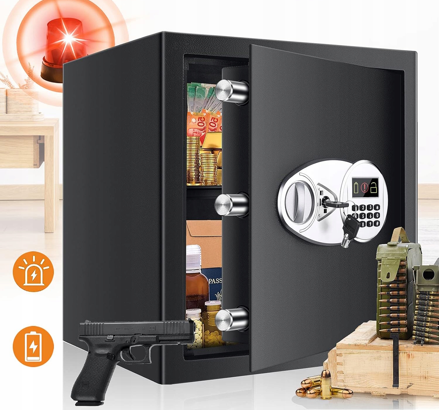 Безопасность была оснащена цифровой клавиатурой с функцией блокировки - после трех неправильных попыток ввести пароль он заблокирован на 20 секунд, и каждое последующее нажатие кнопки сигнализируется звуком. В этом случае сейф может быть открыт только с помощью аварийного ключа. Передняя панель имеет четкий ЖК -дисплей, который информирует пользователя о состоянии батареи и правильности введенного кода. Это гарантия безопасности и удобства в повседневном использовании. Благодаря этим решениям, вы можете быть уверены, что ваши ценные элементы правильно защищены.