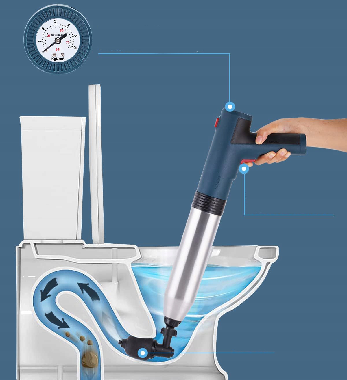 【Простота использования】 Просто нажмите подушку безопасности, положите наконечник в чучела и нажмите кнопку воздуха, чтобы очистить туалет или раковину. Операция очень проста и интуитивно понятна.
