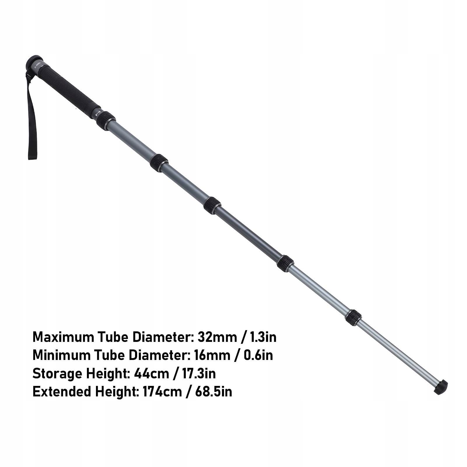 2. 6 ног секции: расширенная нога вращается по блокаде от четверти поворота до предотвращения или блокировки и настраивает монопод за несколько секунд, от 44 см до 174 см. Установите расположенную ручку, чтобы использовать монопод в качестве полюса треккинга.