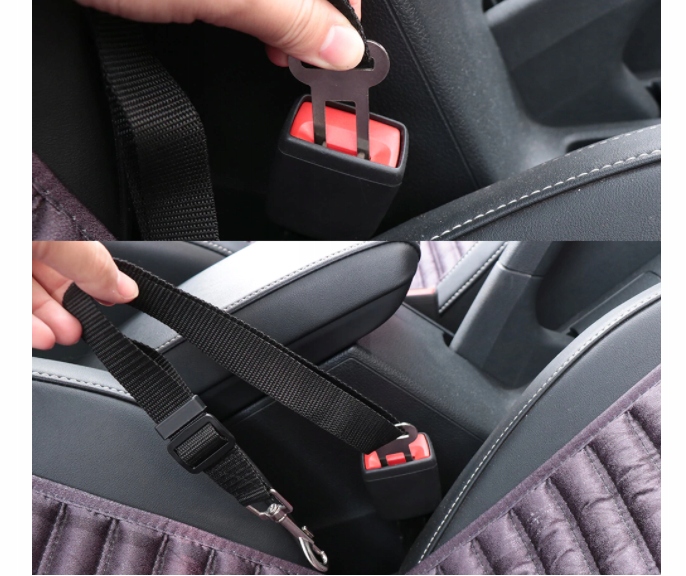 На одном конце ремня имеется традиционный карабин для крепления ошейника, а на противоположном конце - застежка для автомобильных ремней безопасности.