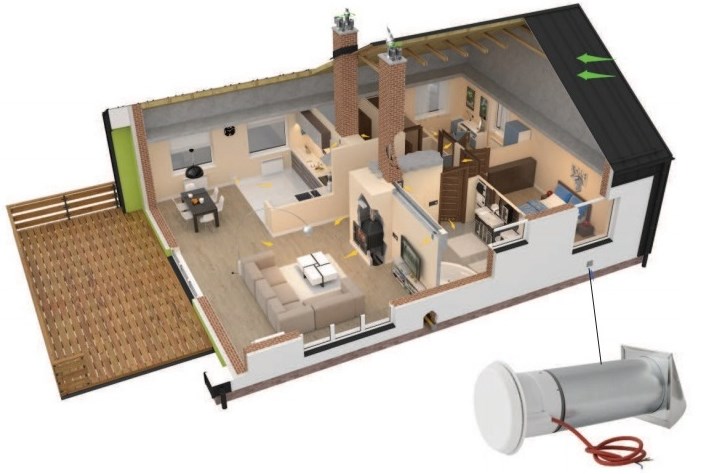 Свежий наружный воздух подается через форточки, установленные в гостиной или спальне. Всасываемый воздух проходит через последующие помещения и удаляется через вентиляционную решетку, обычно устанавливаемую на кухне или в ванной комнате.