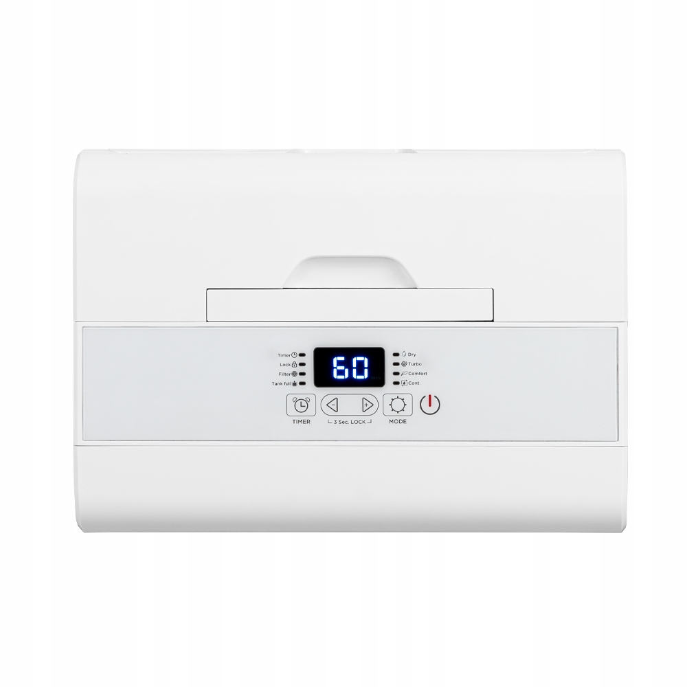 В верхней части устройства есть панель управления с цифровым дисплеем. Благодаря разборчивым, большим кнопкам, устройство чрезвычайно проще, и дисплей информирует текущий уровень влажности в комнате. Кроме того, панель управления включает в себя значки, информирующие об активации таймера, открытого режима эксплуатации, заполнения резервуара для воды или режима непрерывной сушки.