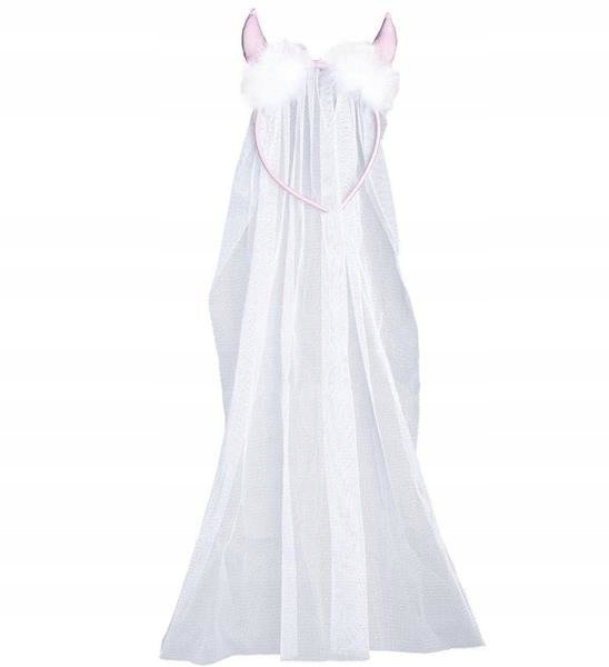 Повязка изготовлена из прочного пластика. Гибкий и легкий, не давит на голову. К повязке прикреплены розовые рога дьявола, отороченные белым мехом, и белая вуаль. Его можно использовать для развлечения или как дополнение к наряду.