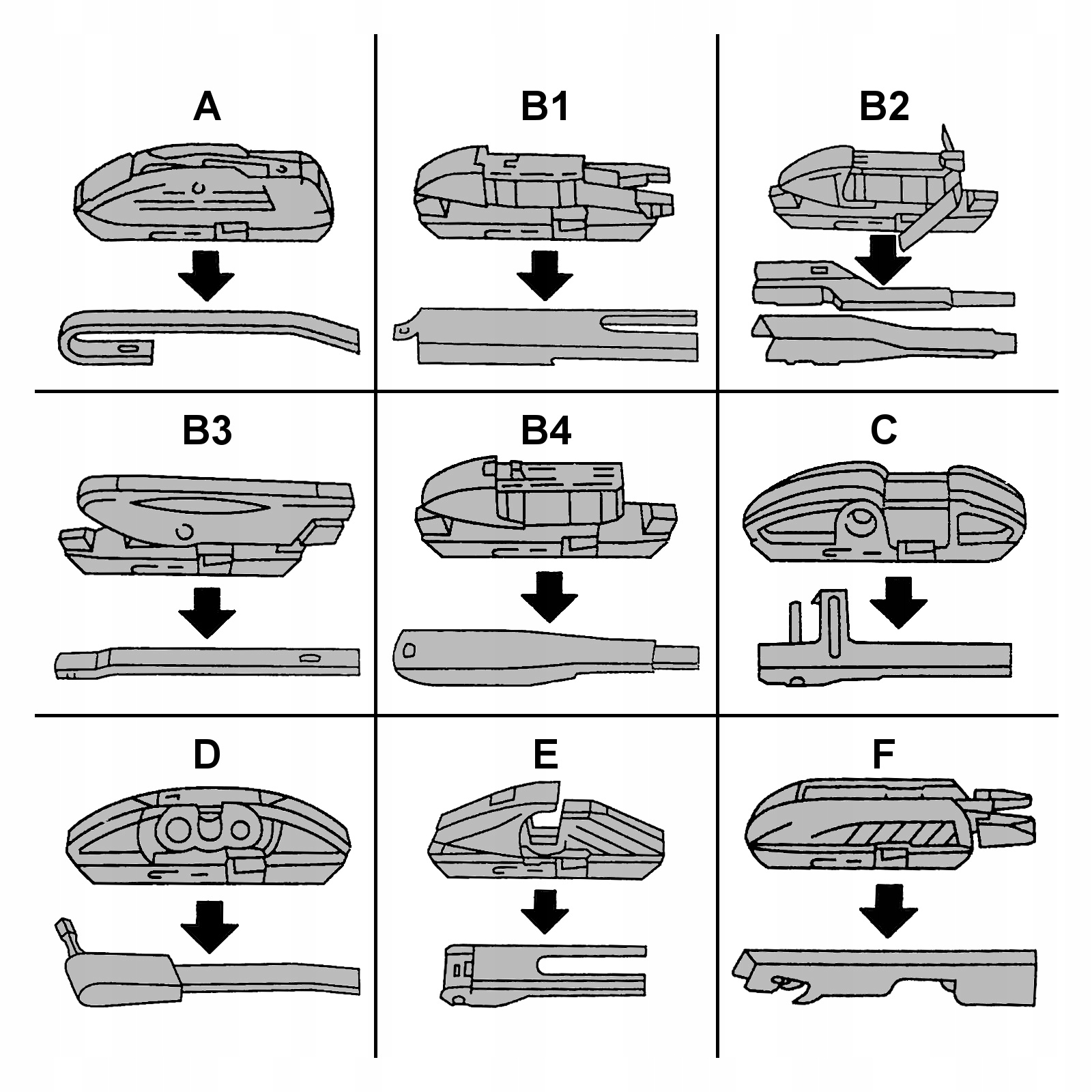 В дополнение к стандартному креплению щетка стеклоочистителя имеет 9 дополнительных адаптеров, подходящих для 10 различных рычагов стеклоочистителей, поэтому она также подходит для многих менее типичных дворников. крючки и делают эту ручку полностью универсальной.