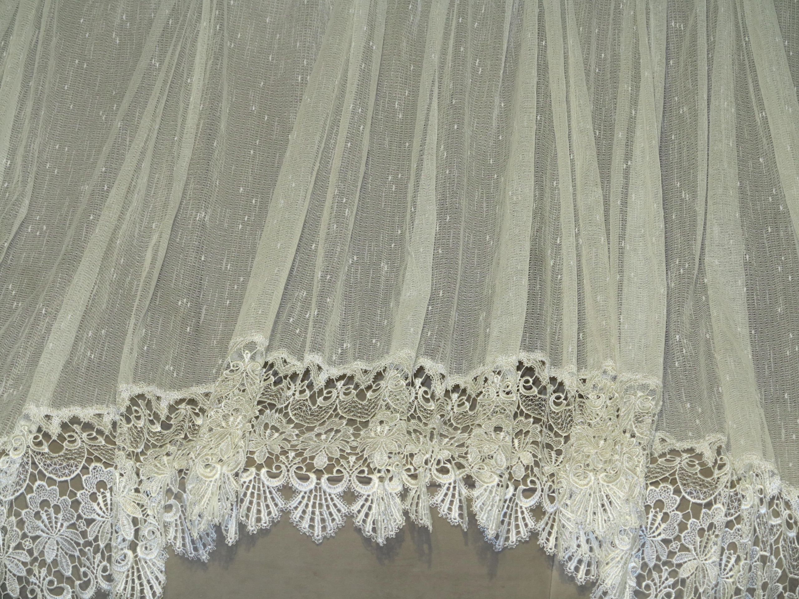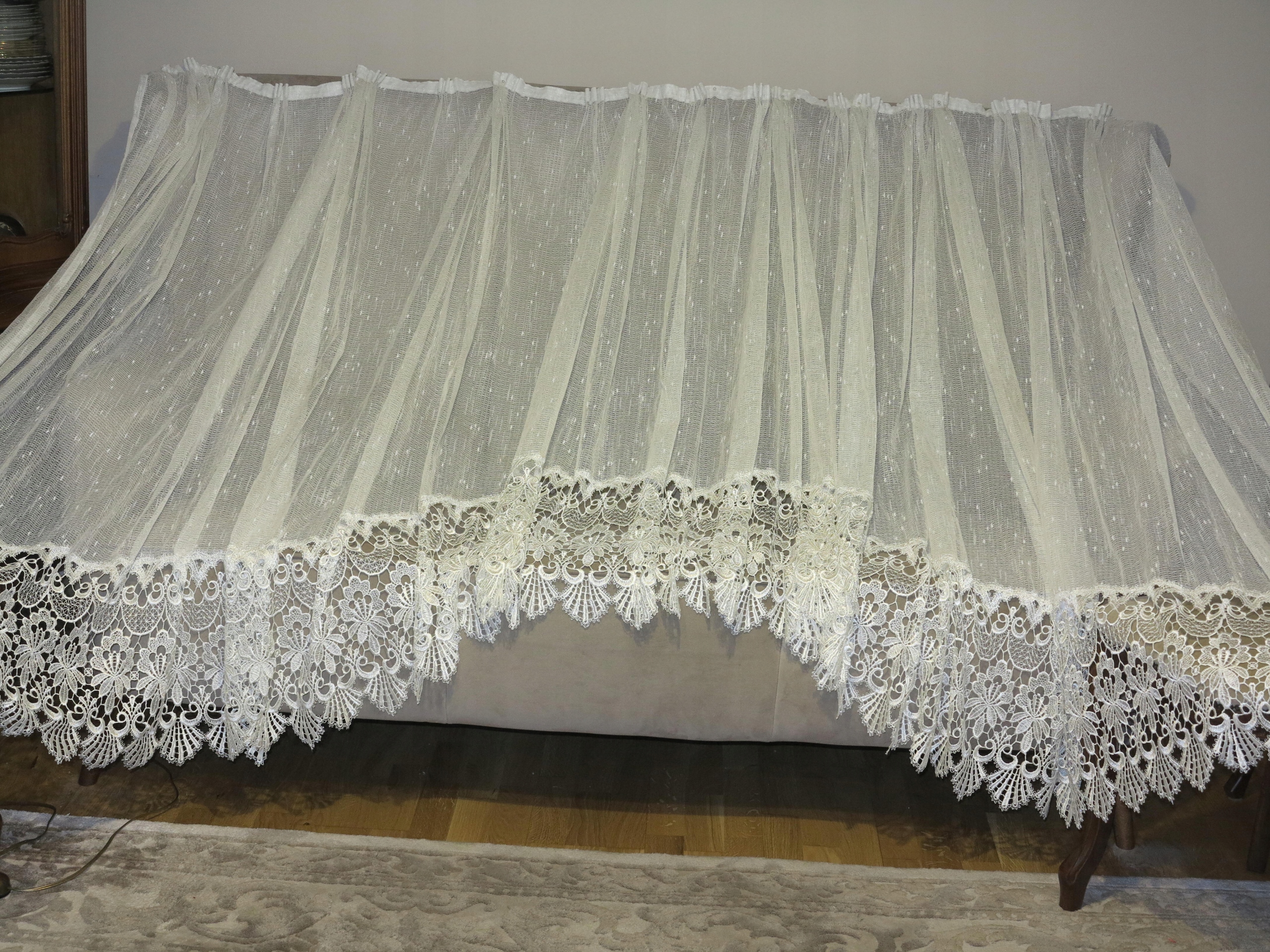 Замечательная занавеска декоративно вырезана в дуге. Яма с залившей жемчужной гипью. Ecru color