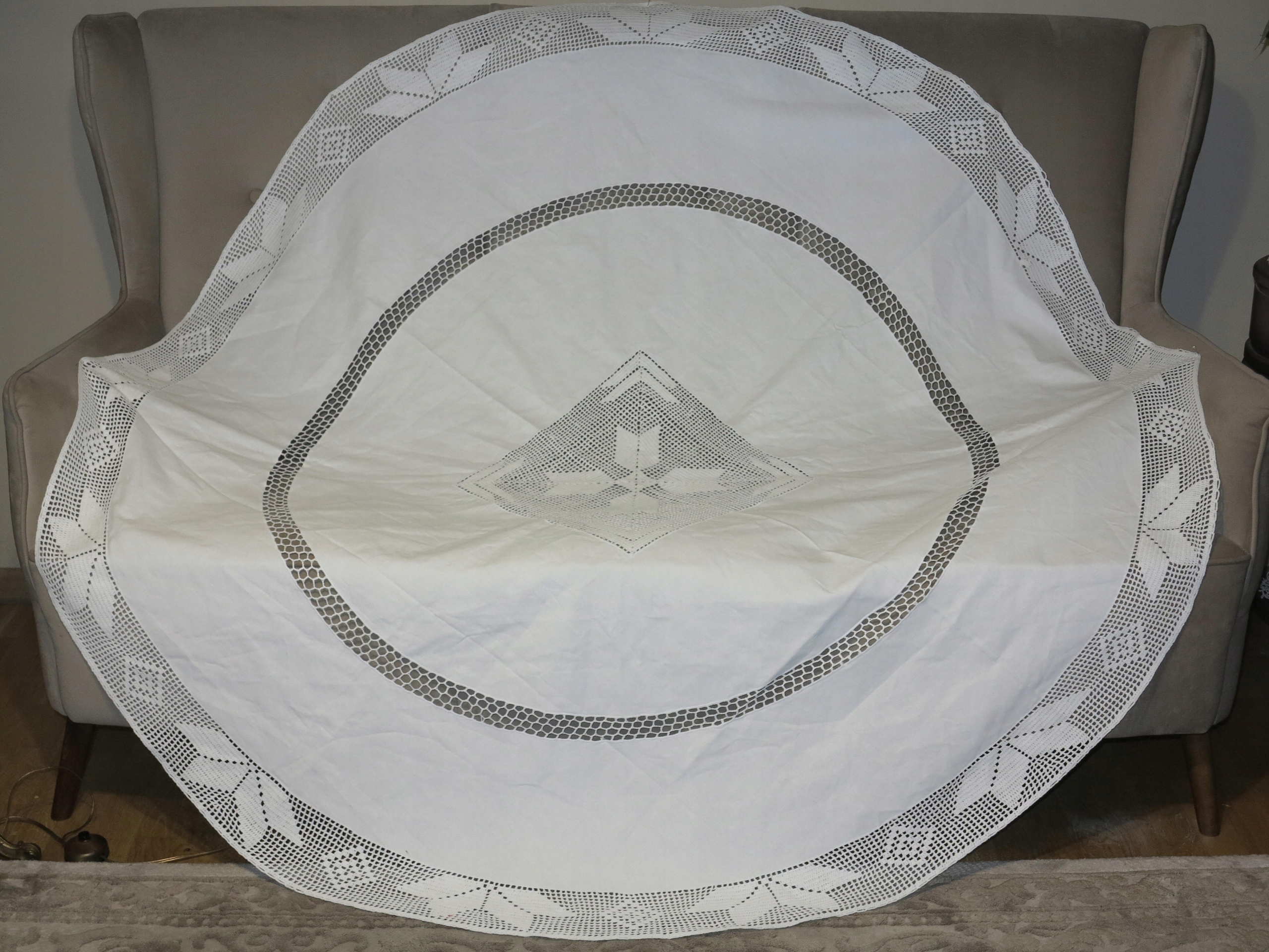 Тема аукциона прекрасна, Bielsieńki Canvas Taklecloth с хройкой. Это выглядит красиво на столе. Он имеет размеры: диаметр: 176 см. Используется, но в отличном состоянии и качество
