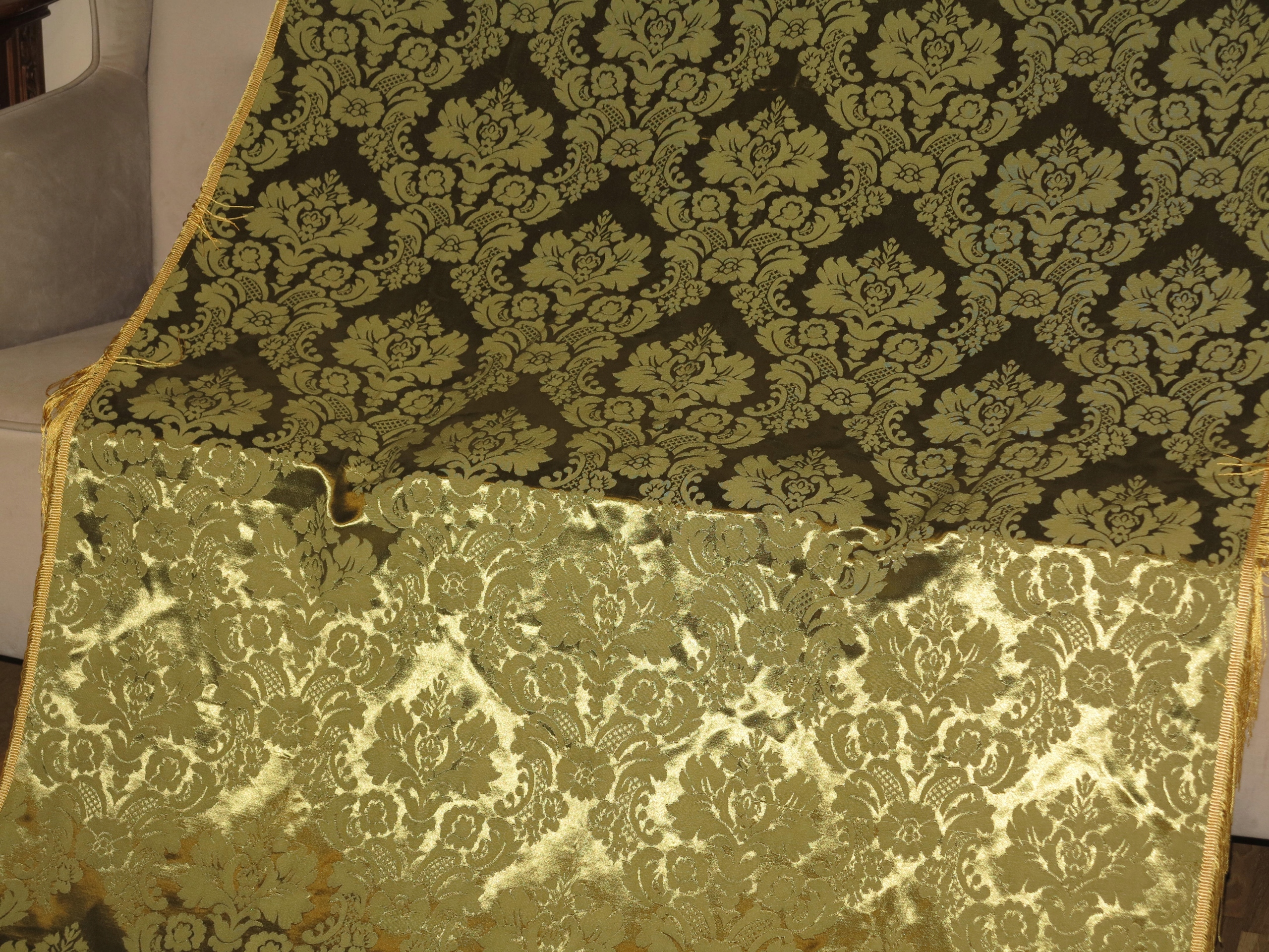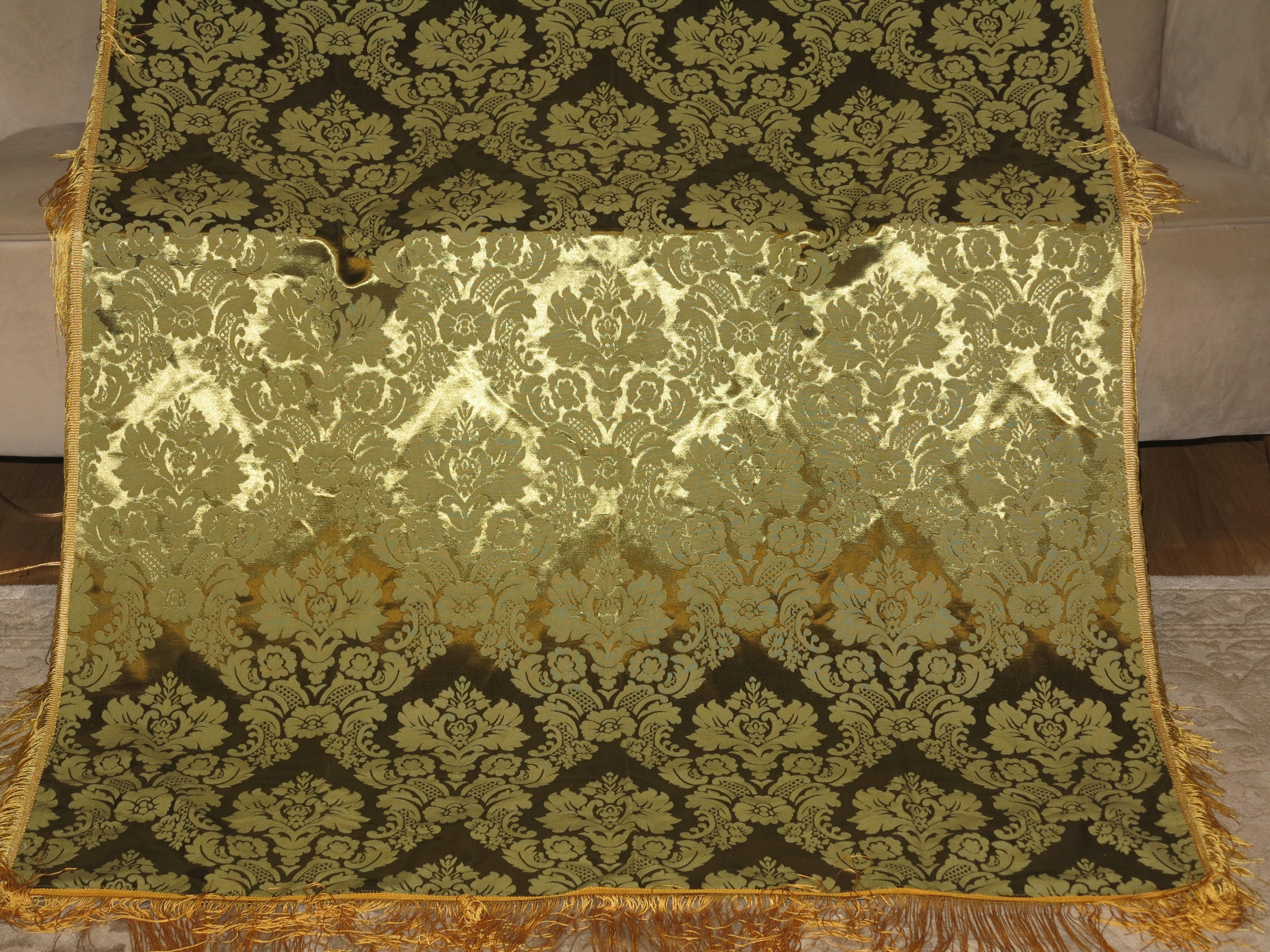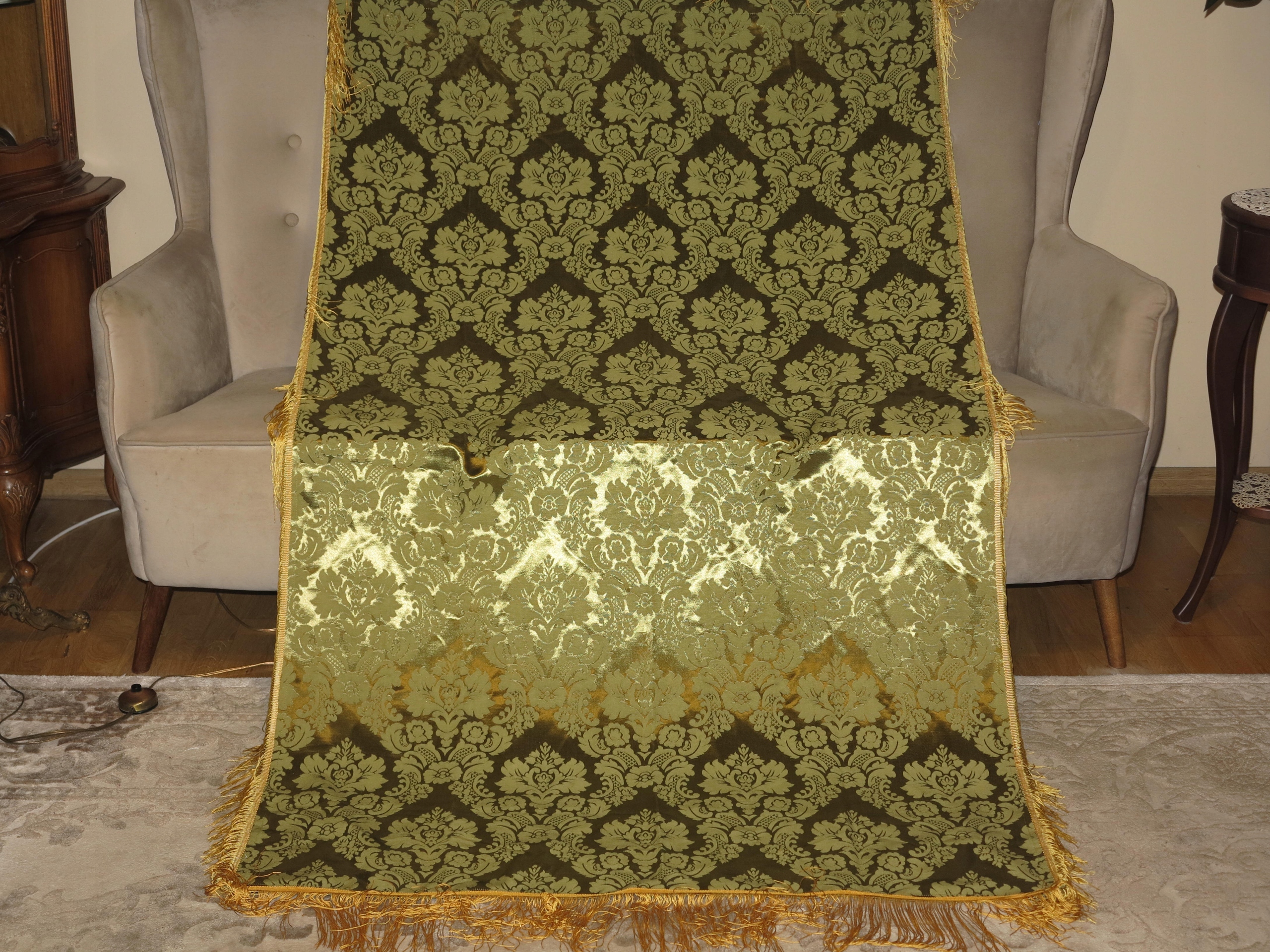 Чрезвычайно красивая скатерть с высочайшим хлопковым осветительными тканью в стильном рисунке, в древней зелени, то же самое, примерно украшенной очень длинной 15 -сантиметровой шелковой окраиной, которая добавляет необычное очарование к таблице