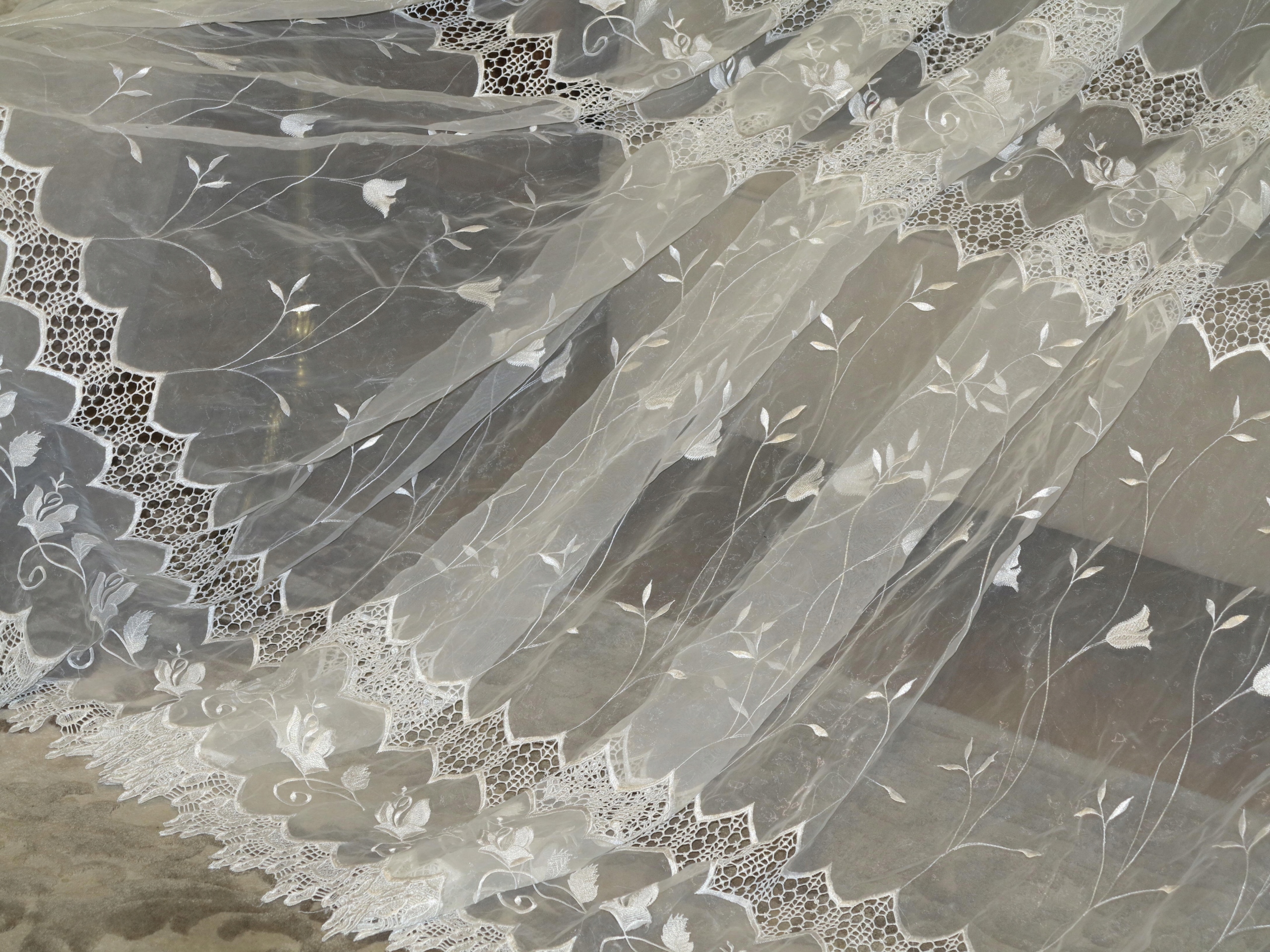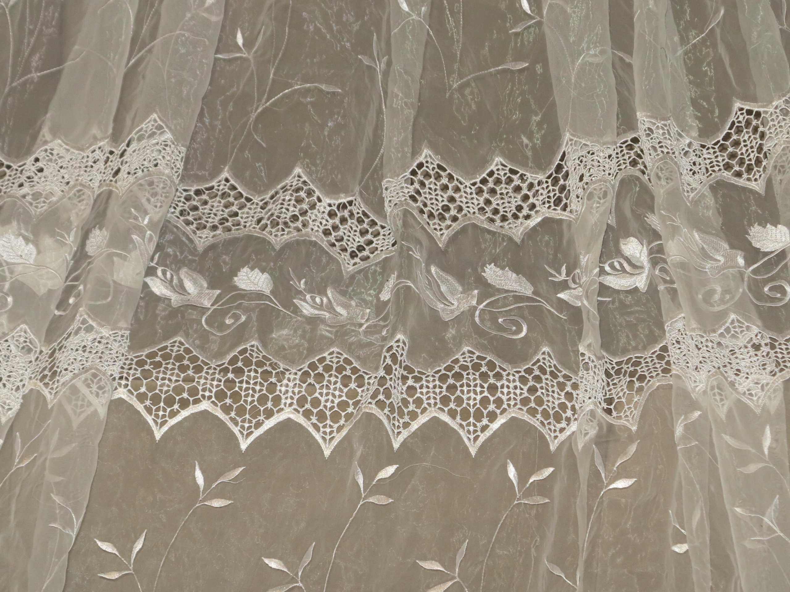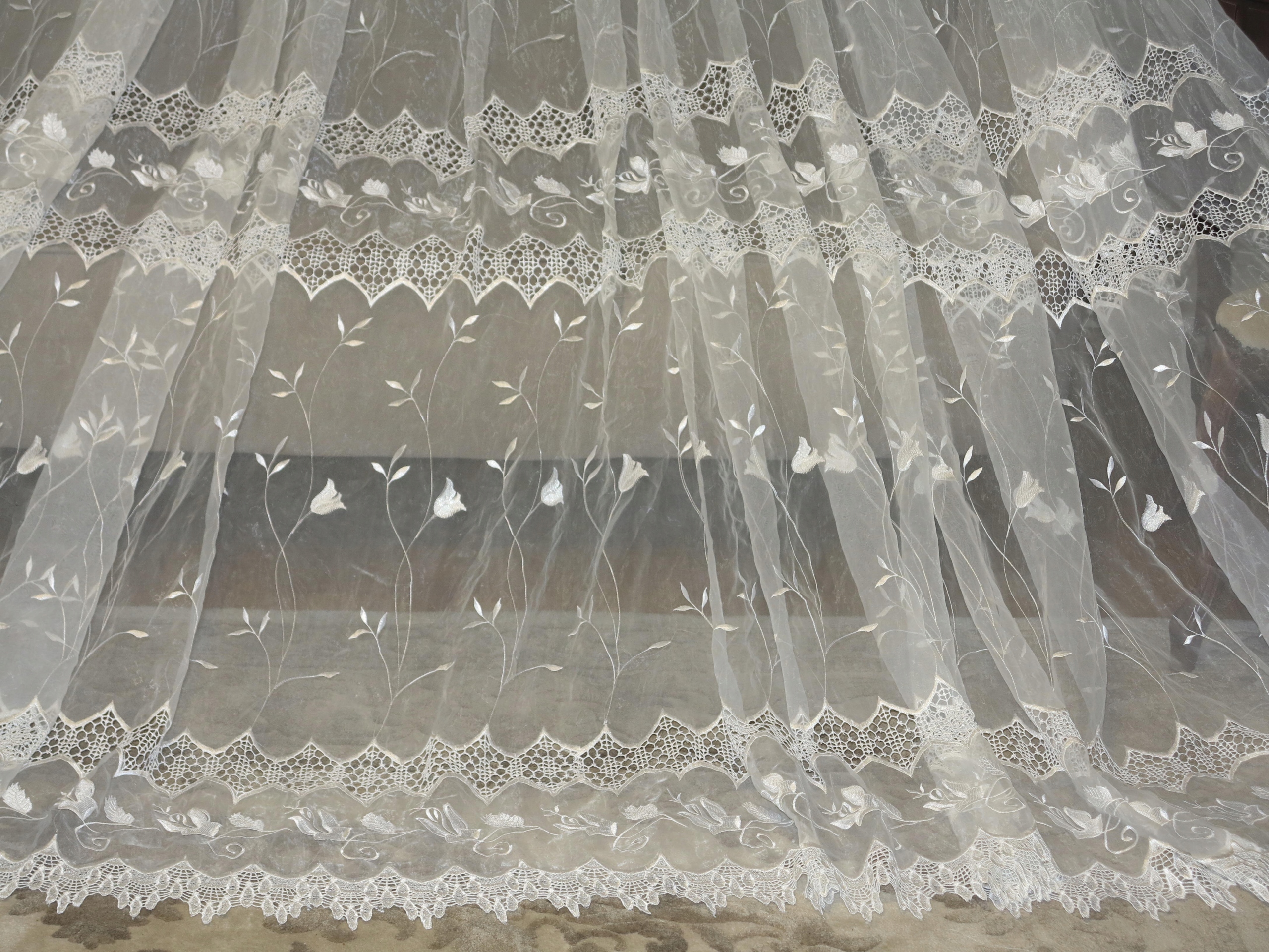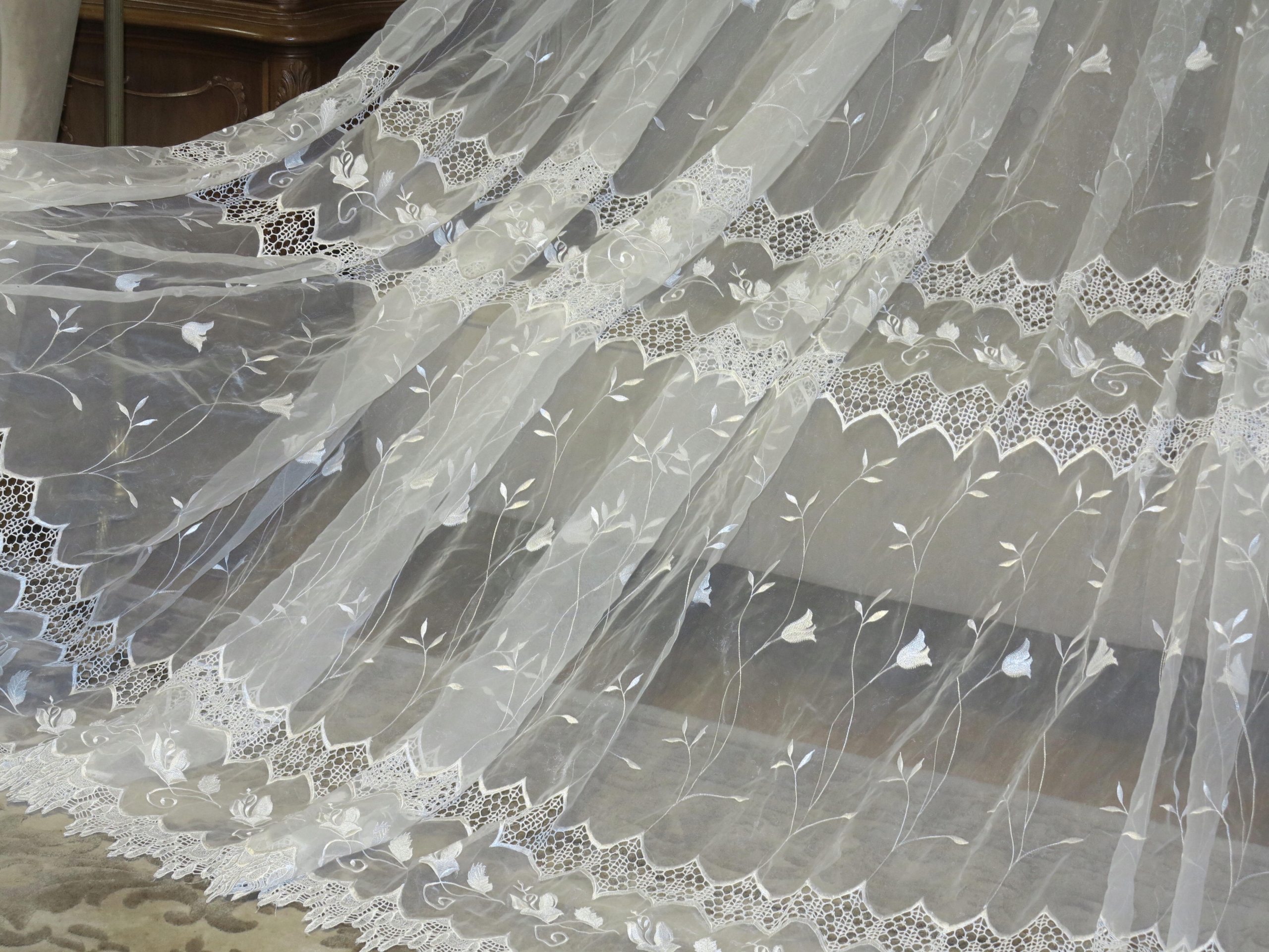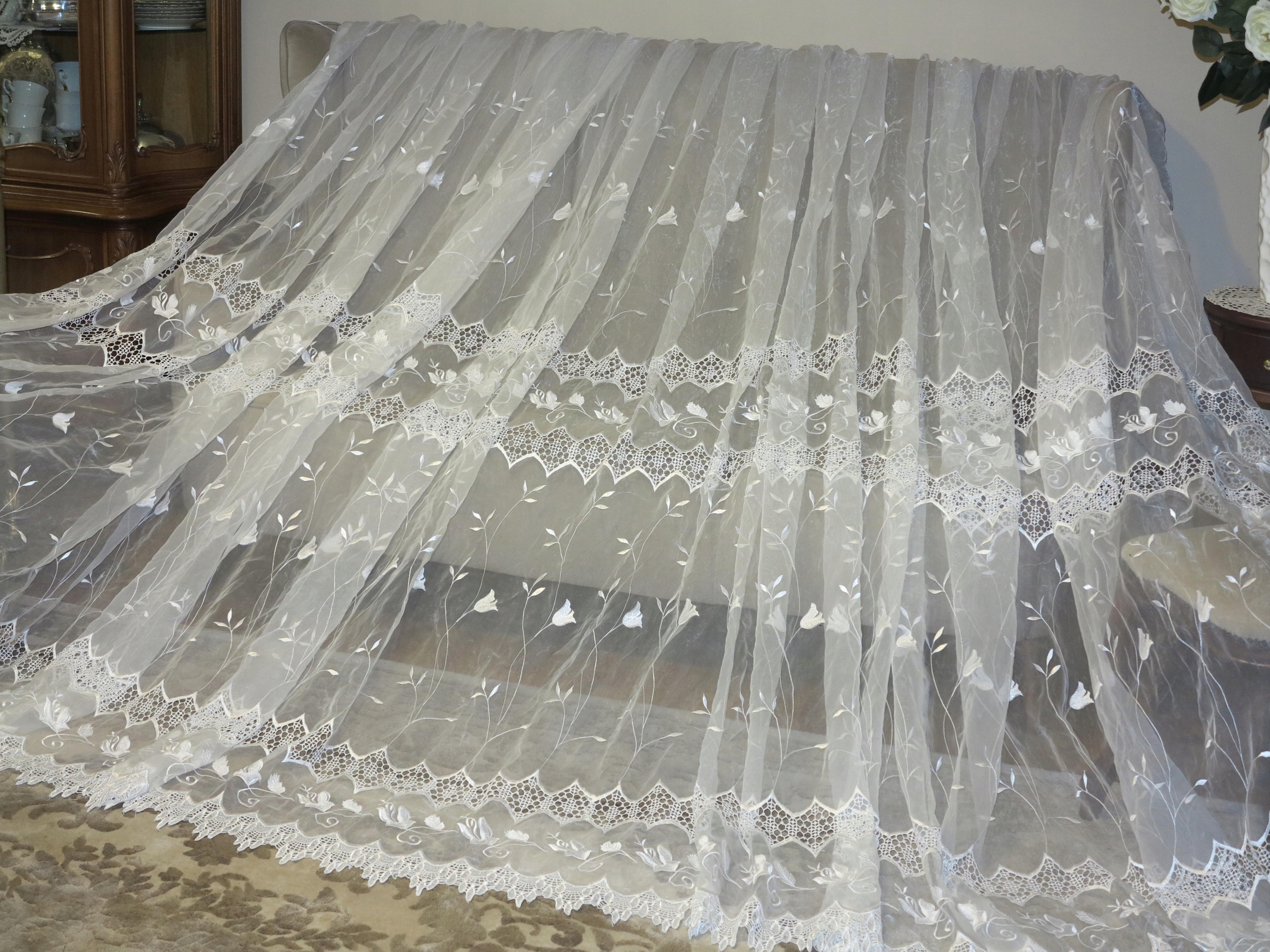 красивую широкую белую занавеску с богатым жемчужной вышивкой