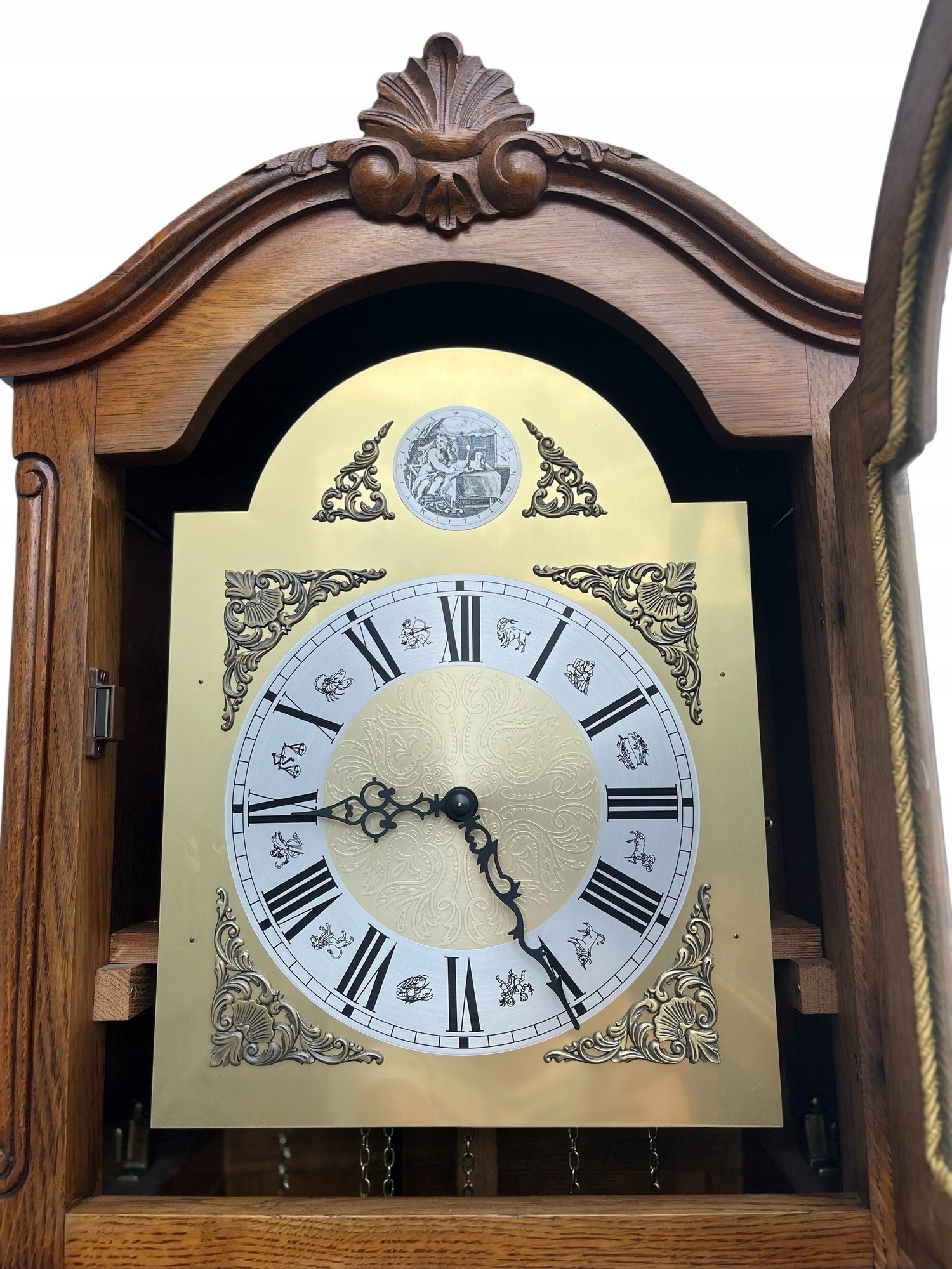Часы были отремонтированы в нашей студии, грудь была очищена и окрашена плотником. Механизм часов регулируется, потому что он происходит после профессионального обзора в The Watchmaker. Часы -это трехдневный, цыплят, имеет мелодичный, нежный звук.