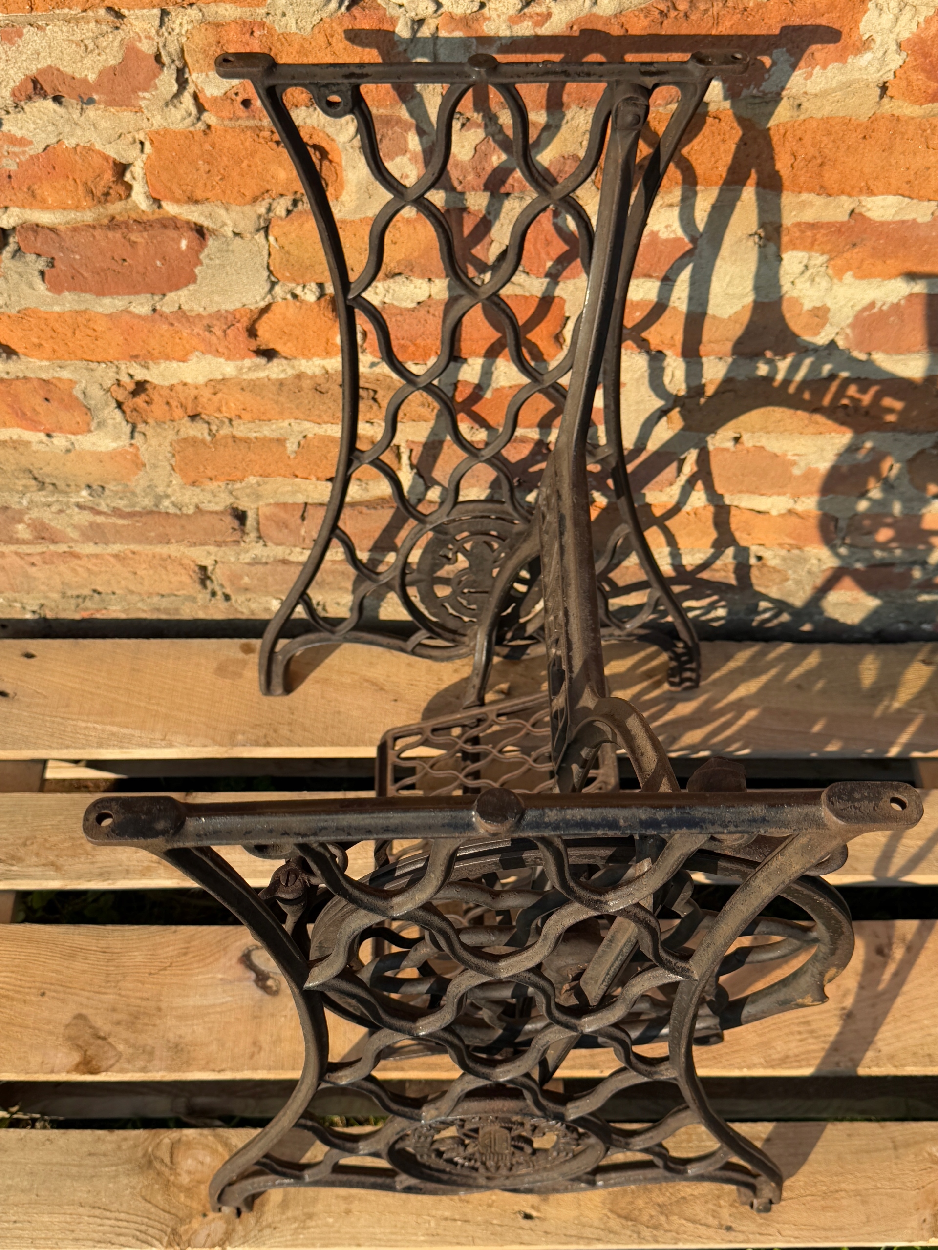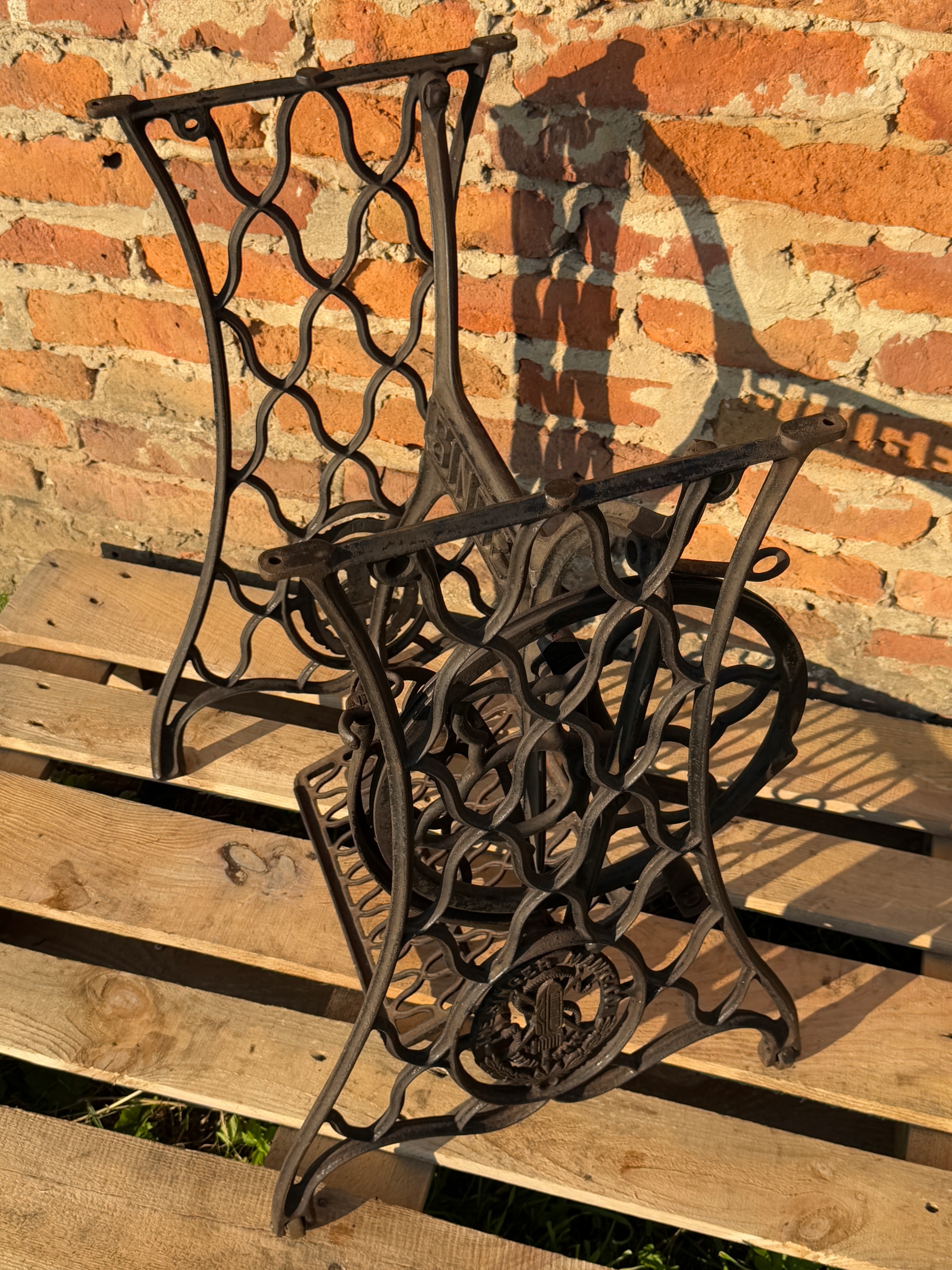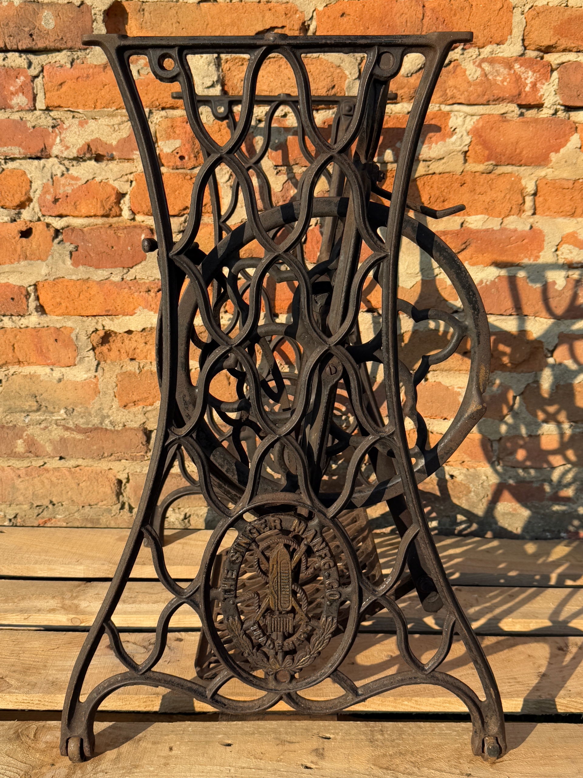 Объект продажи - старая чугунная база от швейной машины певца. Очень хороший рисунок, богато украшенный. Певец Манфг надписи по бокам. ЧТО. Торговая марка. имеет оба колеса в нижней части.