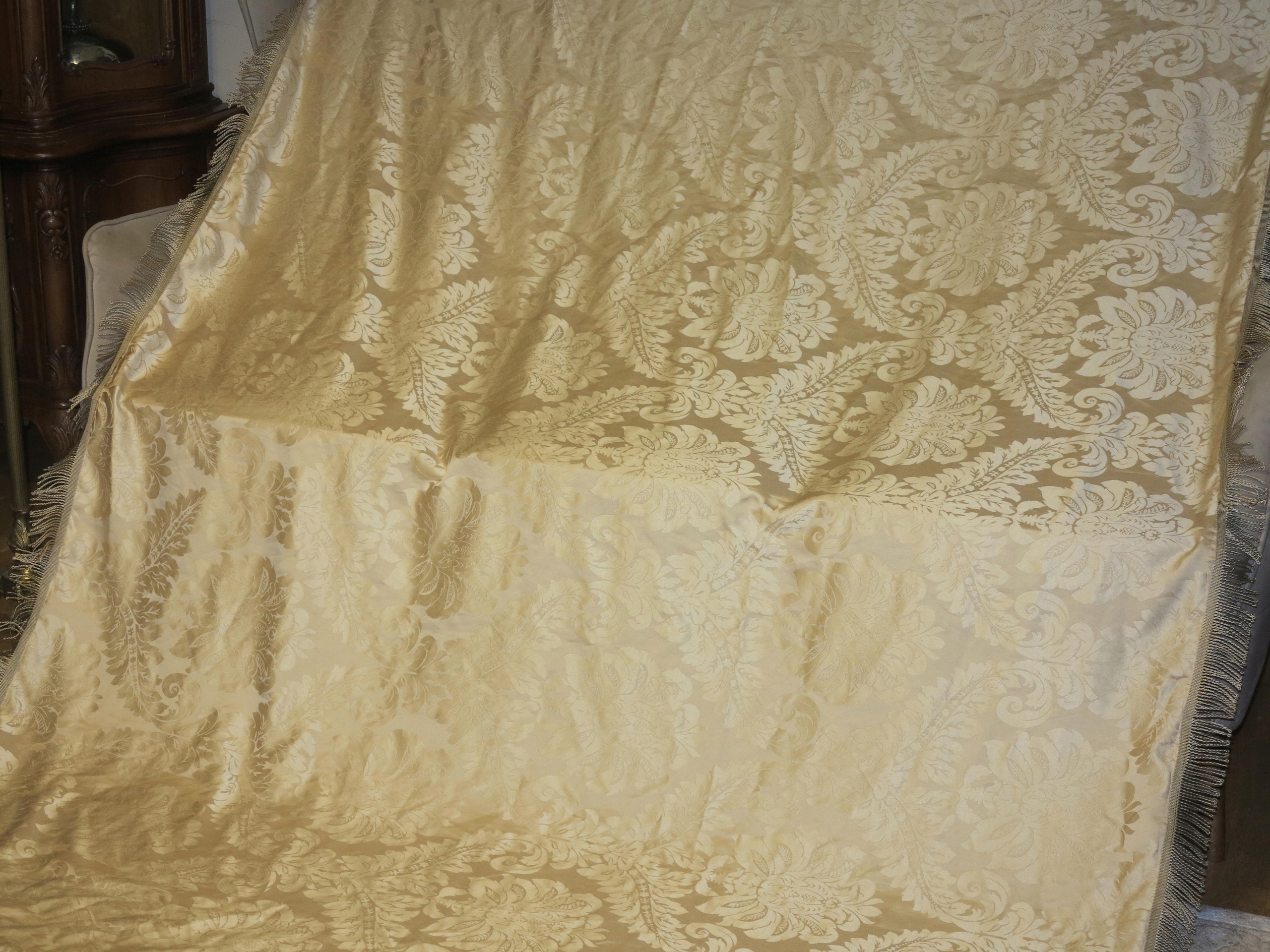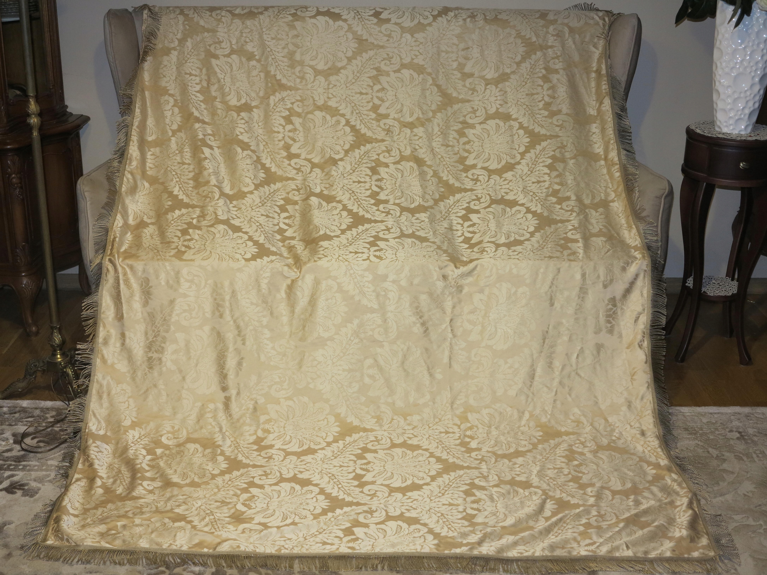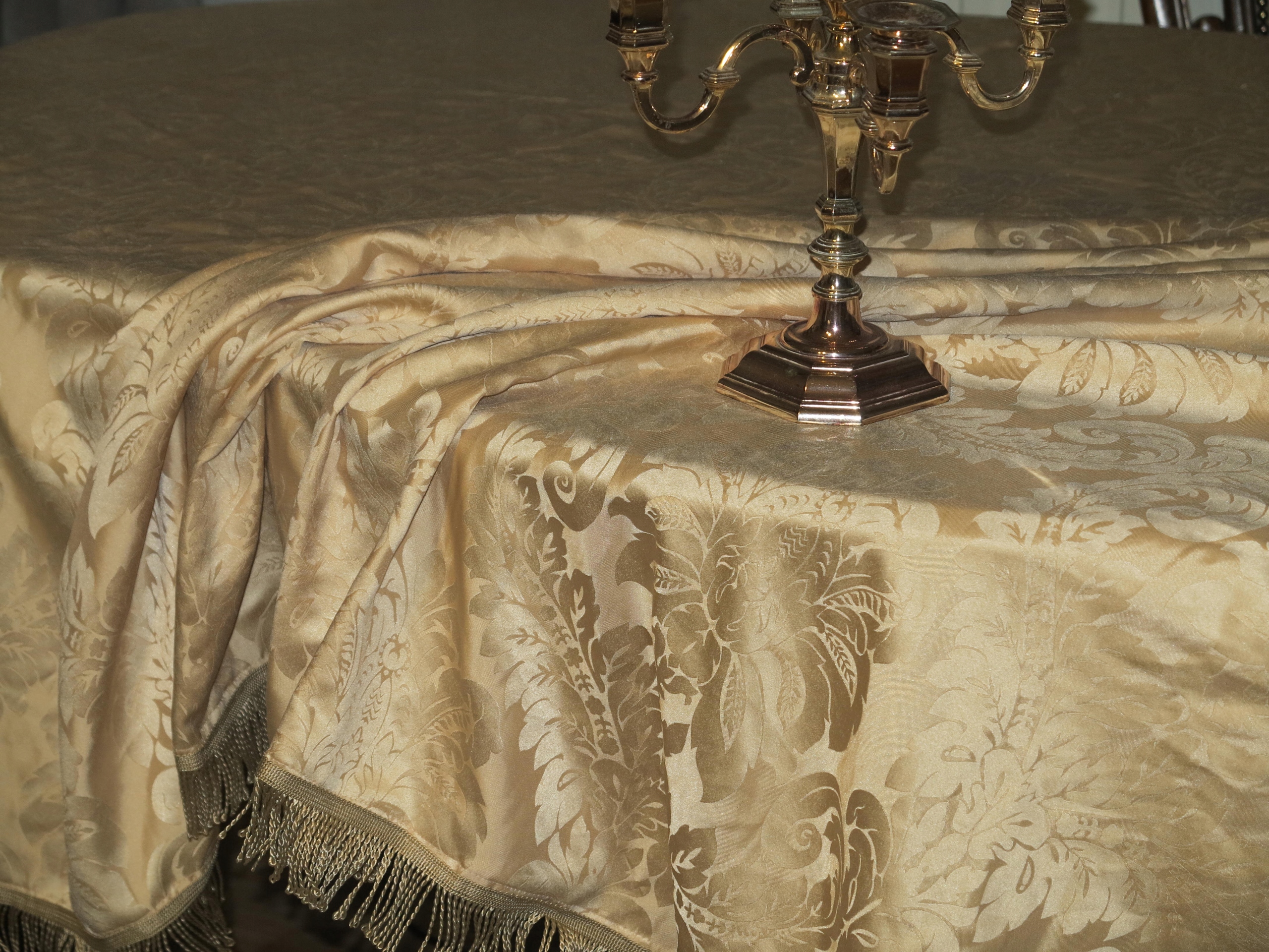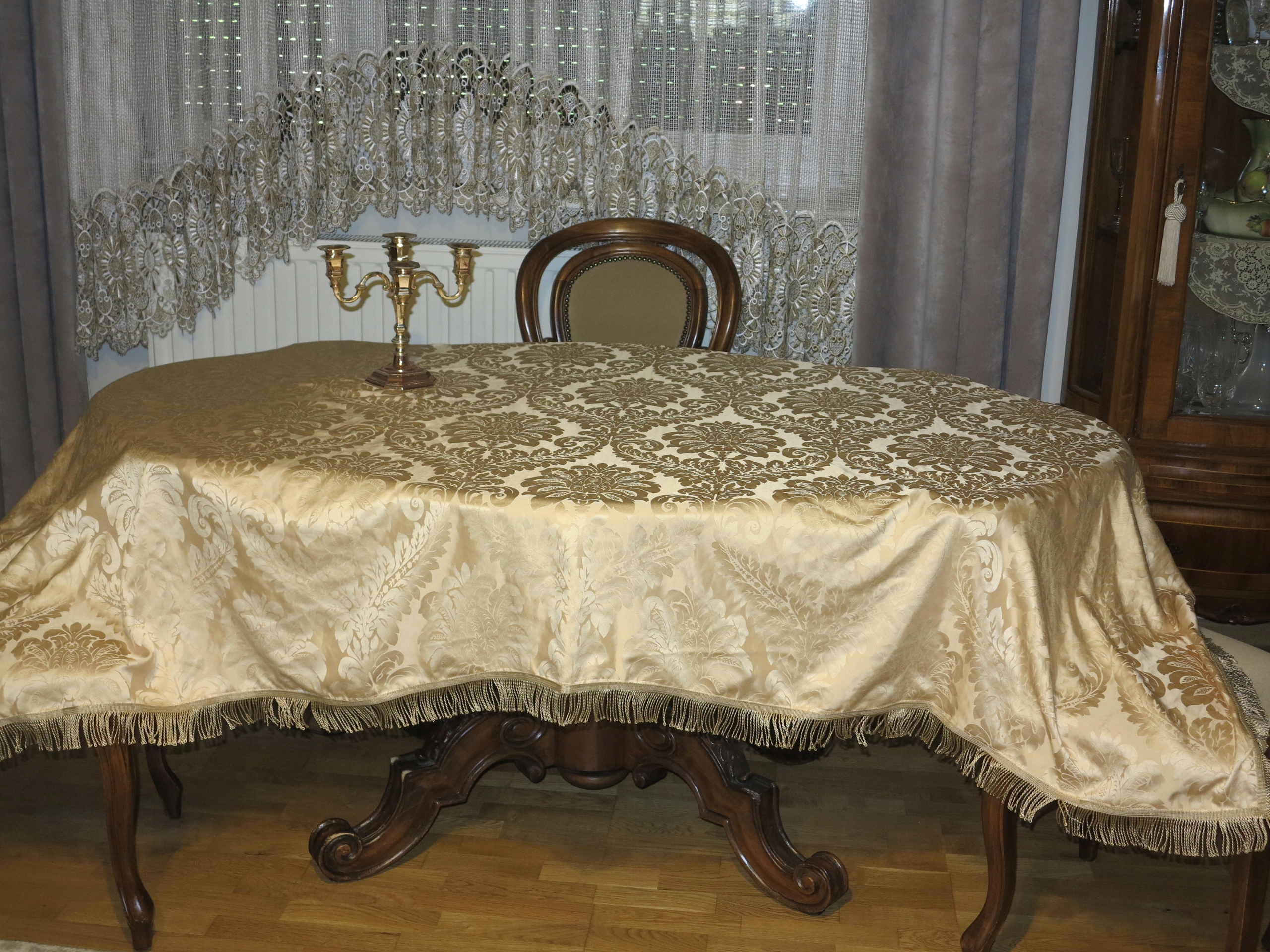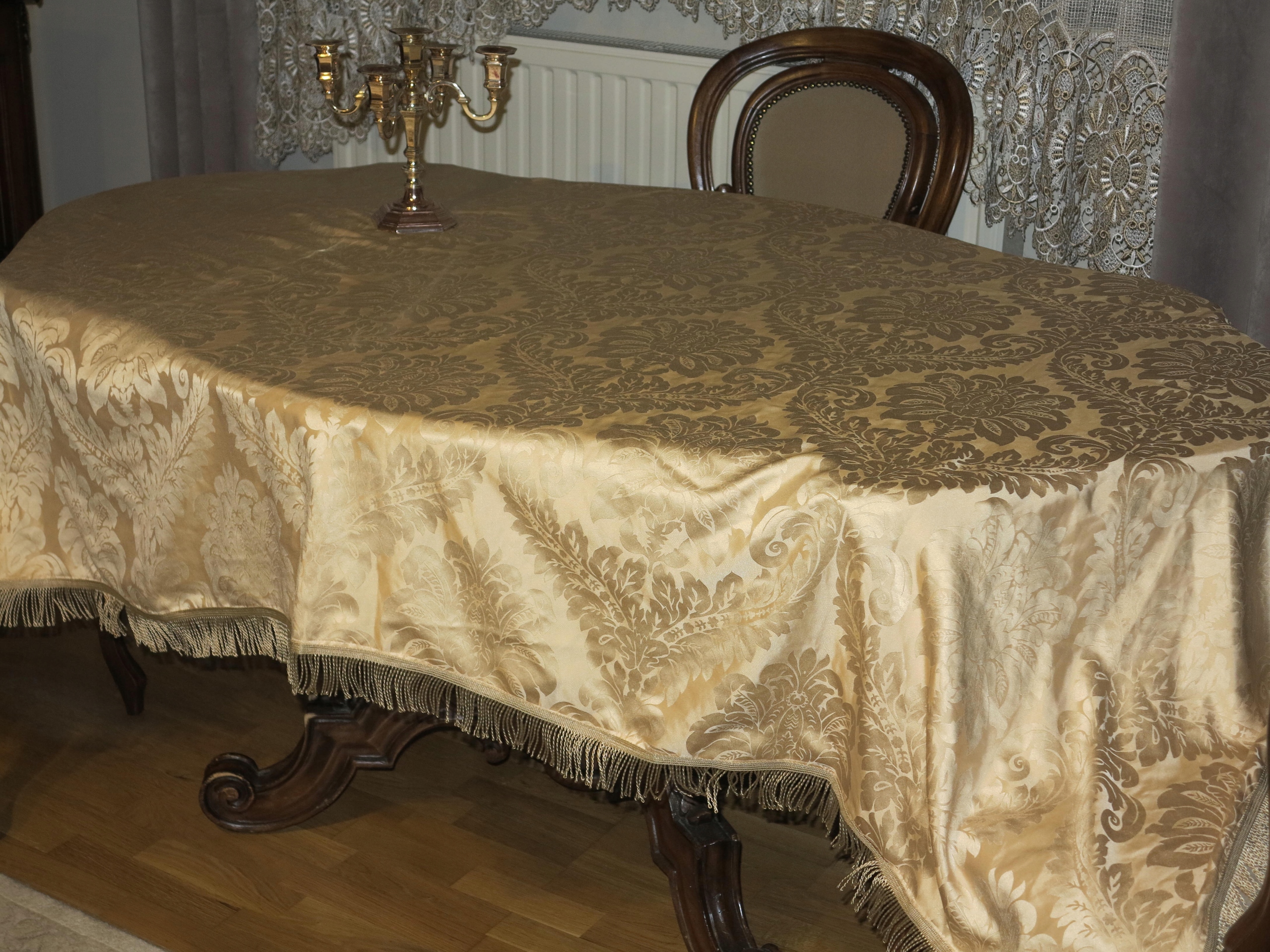 Тема аукциона - это красивая стильная скатерть из синтетической, заливающей ткани золотистого цвета, с забитым рисунком Acanthus. О золотых полосах. Строга имеет размеры: 223/159 см плюс для около 5 см. Используется скатерть, в супер хорошем состоянии, с крошечным минусом. Я рекомендую