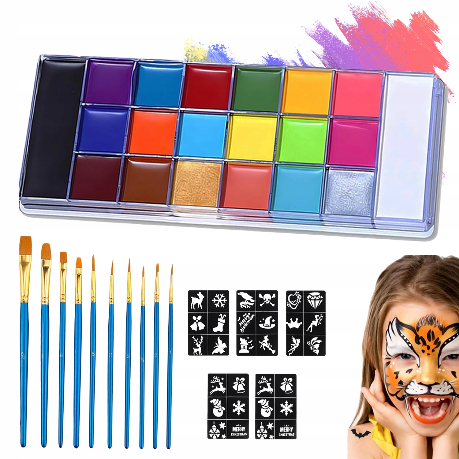 20 цветов карнавальной макияжа, 10 кистей, 5 шаблонов, 30 различных дизайнов, подходящие для всех видов фестивалей, событий, событий. 20 цветов лица и живописи, цвета могут быть легко затенены, чтобы создать различные косметики, которые будут отвечать потребностям различных случаев.