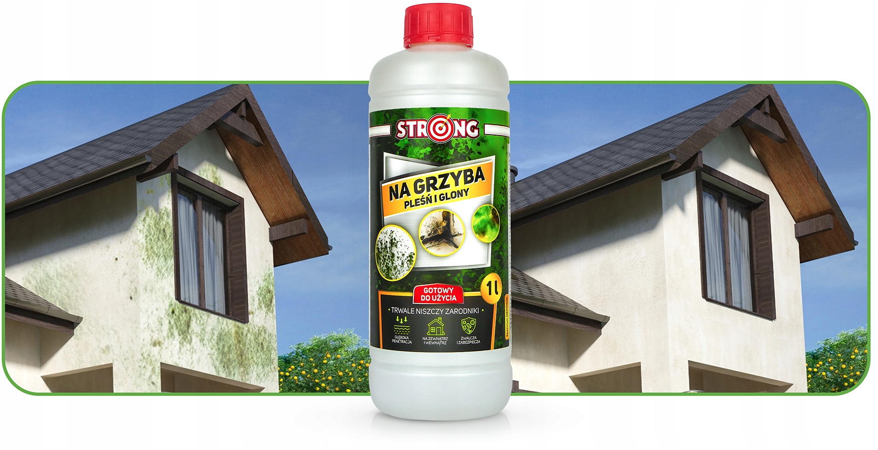 STRONG также идеально подходит для защиты различных строительных материалов от воздействия плесени, грибков и водорослей. Можно использовать на кирпиче, камне, бетоне, штукатурке и других гладких и пористых поверхностях, где он прекрасно борется с грибком и спорами плесени.