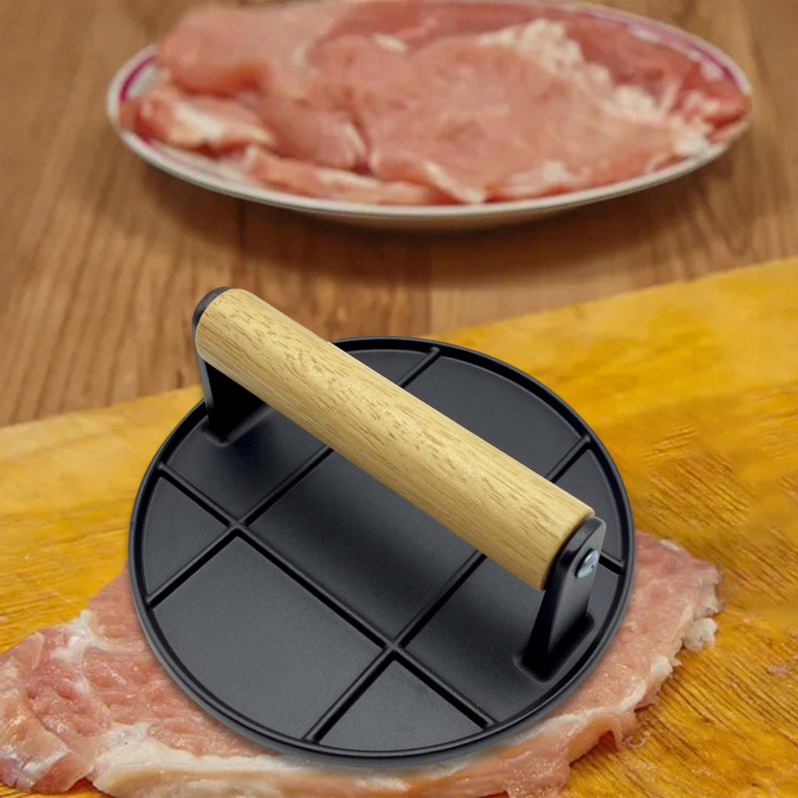 [Принадлежности для гриля]: плоский тендерайзер для мяса специально разработан для гамбургеров с плоской верхушкой, гриля, сэндвичей, стейки и сыры. Идеально подходит для приготовления на гриле различных продуктов и мяса.