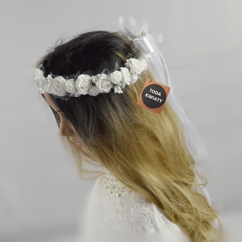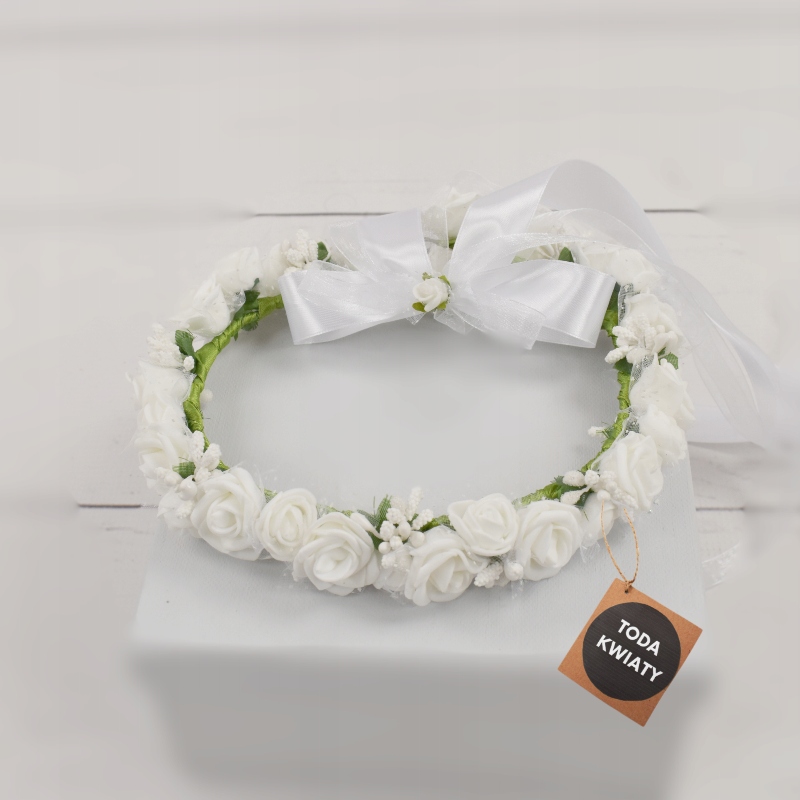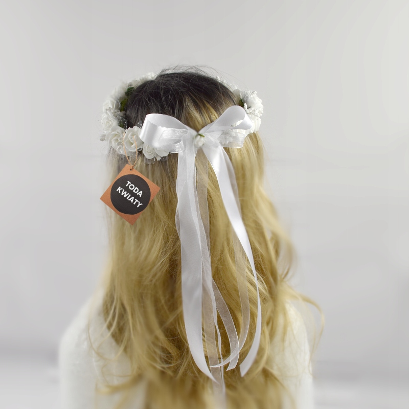 - венок стандартной окружностью около 0 см, регулируется тонкой лентой под другие обхваты головы ребенка