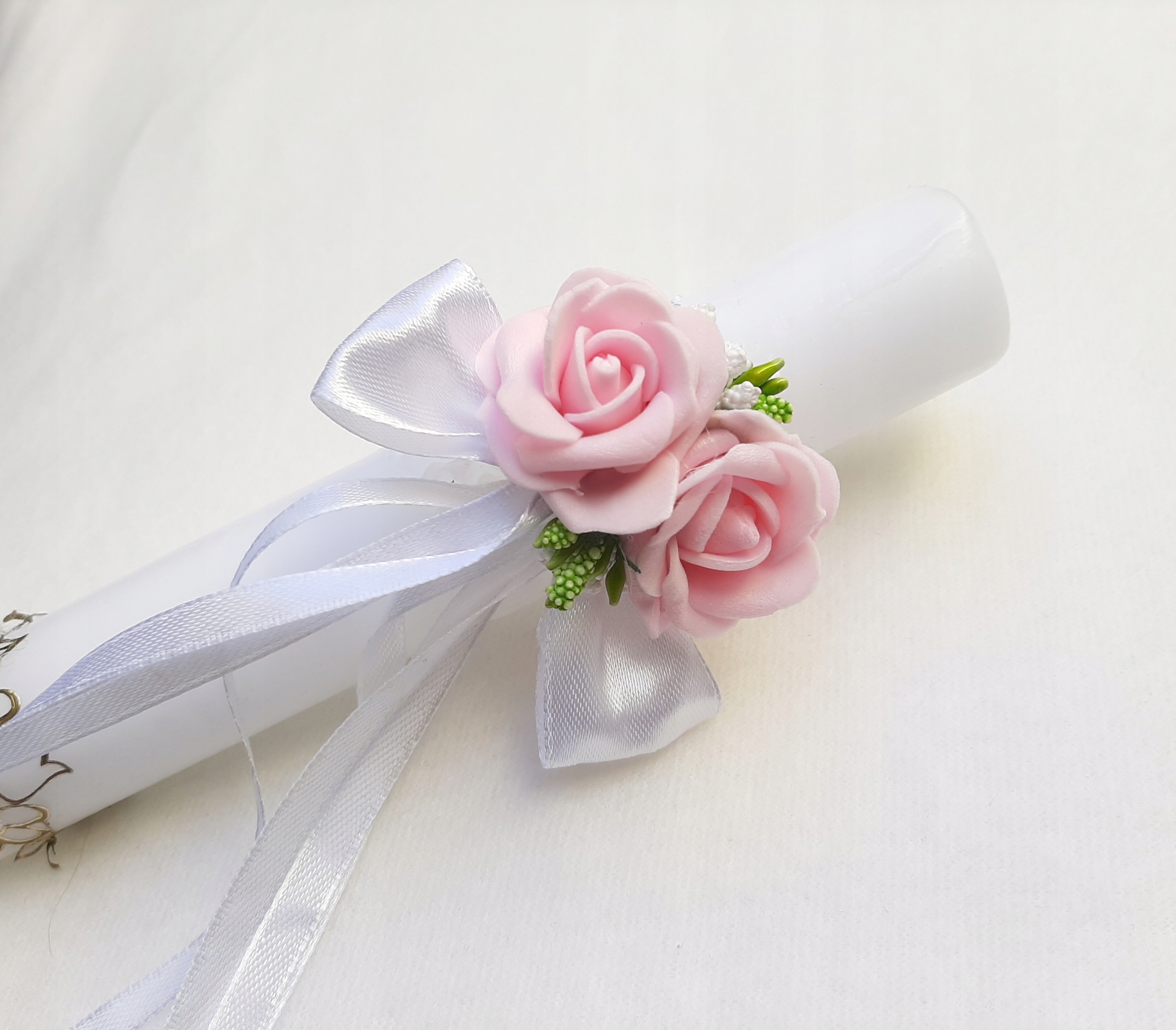 Украшение свечи выполнено из тех же цветов, что и венок, поэтому в целом получается красивый комплект. цветы размещены на эластичном шнурке, поэтому все хорошо прилипает к свече. Свеча не продается!