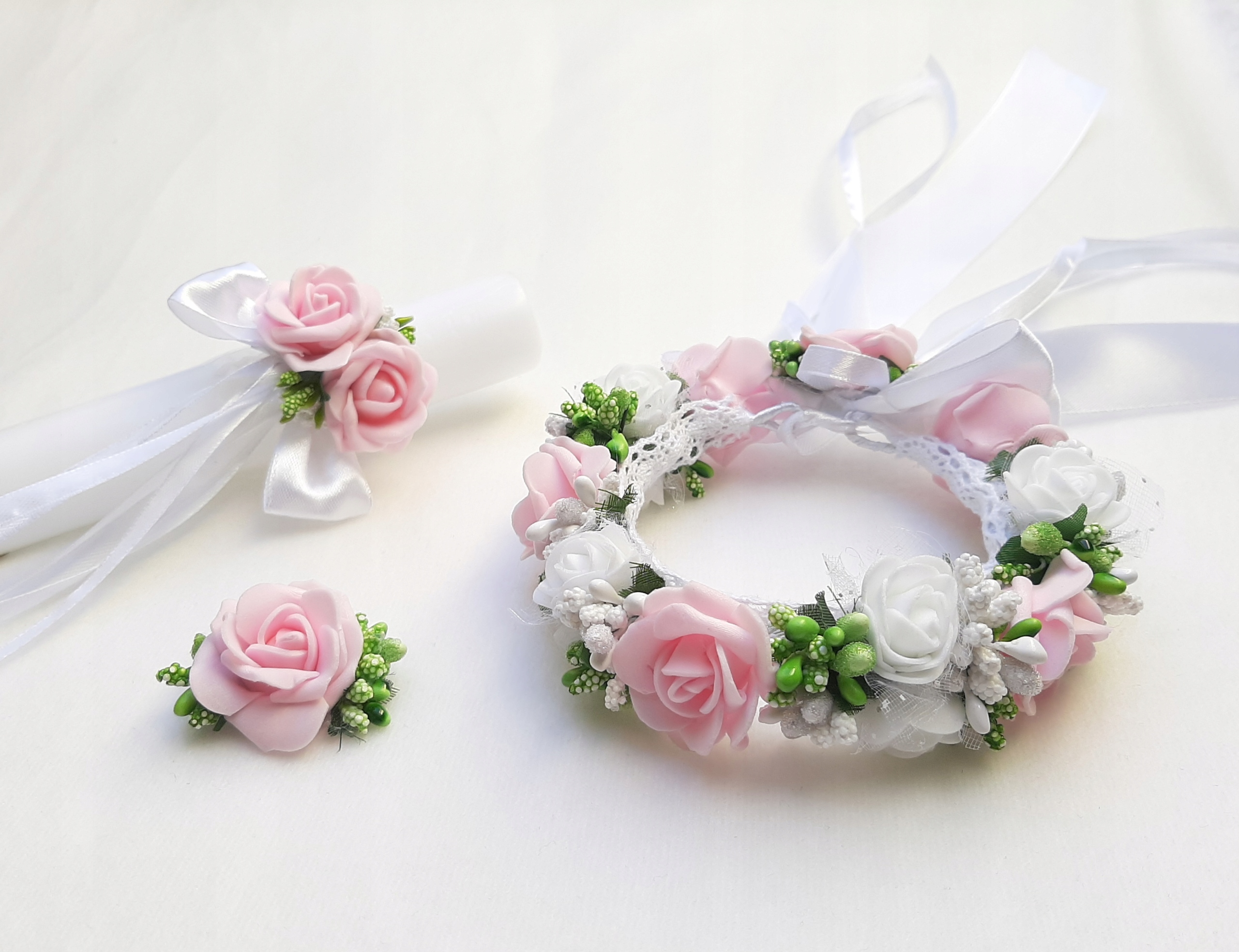 Венок выполнен из пенопластовых роз и цветочных аксессуаров. Цветы выглядят очень реалистично, делая девушку нежной и нарядной в день Святого Причастия.