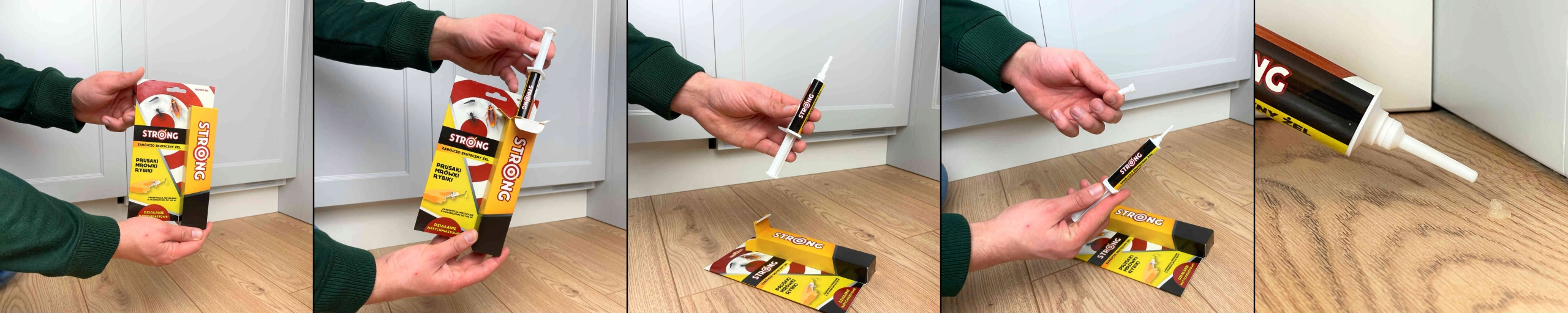 Яд следует выдавливать из шприца в защищенных местах, на краях, в трещинах, щелях, дырах, под шкафами, вблизи мест укрытия насекомых, местах, где они собираются или пешие маршруты. Перед использованием удалите как можно больше естественных источников пищи для насекомых (отходы, пищевые отходы и т. д.) из зараженной зоны, поощряя потребление геля.