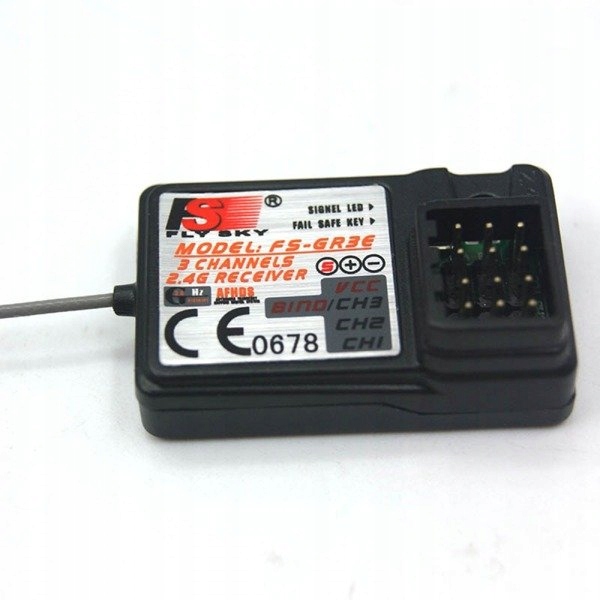 3-канальный приёмник FS-GR3E работает в системе AFHDS на частоте 2,4 ГГц. Odbiornik jest kompatybilny z nadajnikami FlySky GT2, GT2B, GT3, GT3B, GT3C, T6, CT6B, GR3E i TH9X. Приемник предназначен для радиоуправляемых грузовиков, багги и лодок.