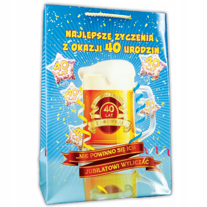Элегантный подарочный пакет с забавной надписью в честь 40-летия. Пакет изготовлен из плотной лакированной бумаги.