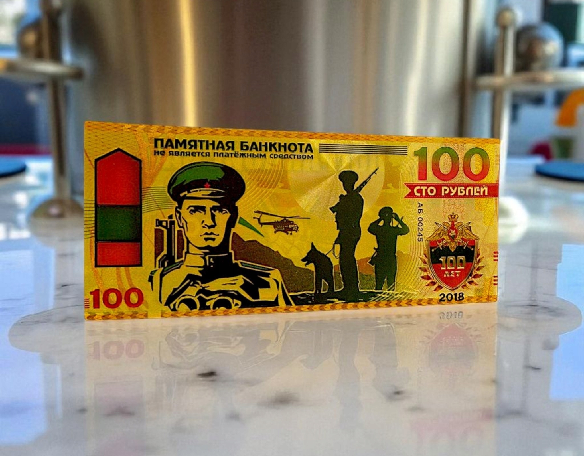 Уникальная возможность для коллекционеров! Я предлагаю оправданную банкноту с золотом с деноминацией 100 рублей, сделанной из прочного ПВХ и украшенной золотистыми акцентами. h2> банкнота была выпущена по случаю 100 -й годовщины пограничных войск (Pograoniчne -voйska) в 2018 году и является прекрасным праздником истории и военной символики.