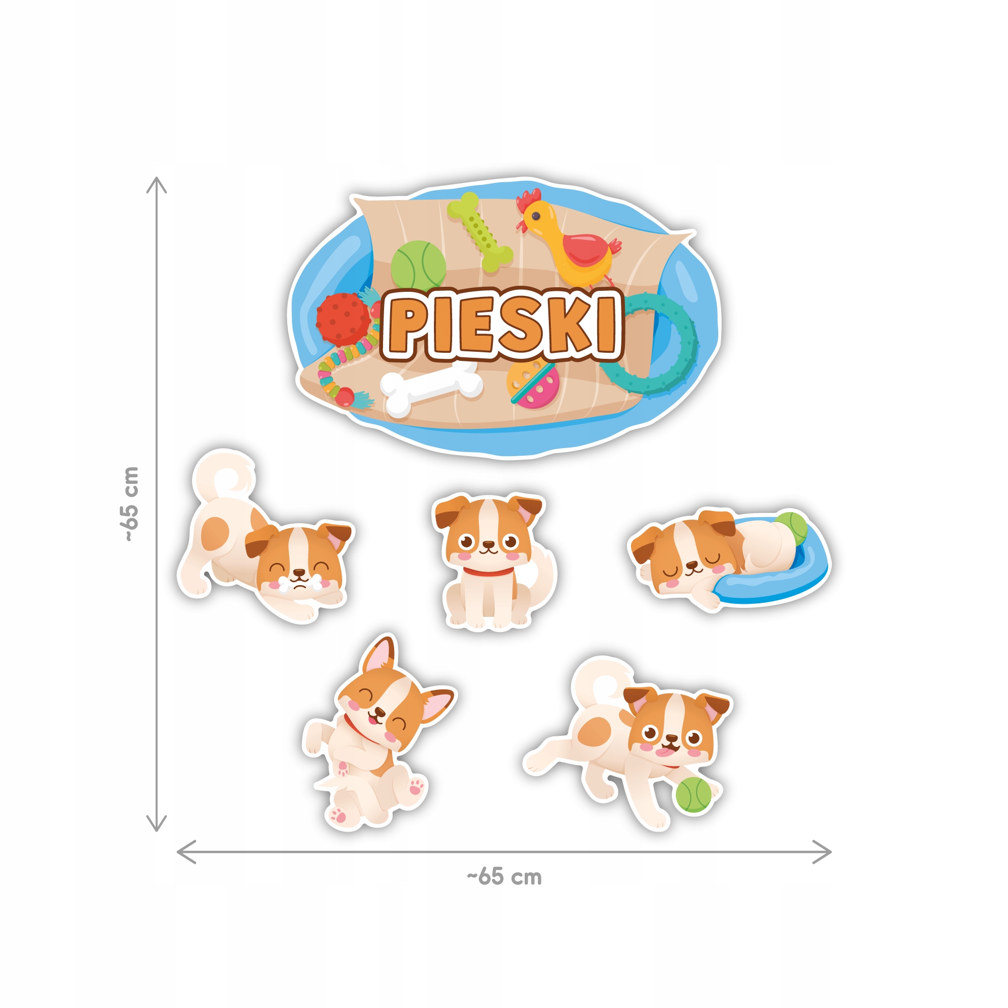 Набор включает в себя 6 красочных элементов - 1 Большая табличка с надписью «Собаки» и 5 собак собак.