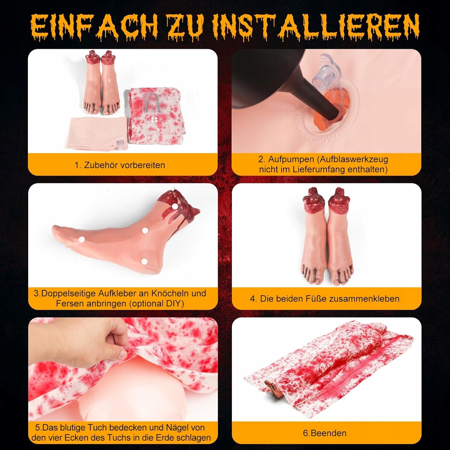 - Легкая сборка - Установка сцены для Хэллоуина -это детская игра. Во -первых, просто надуть реквизиты на Хэллоуин, используя воздушный насос (он не находится в сфере доставки). Затем прикрепите отделенные ножки с двумя наклейками (в соответствии с прикрепленными инструкциями). Затем покройте реквизит тканью, окрашенной кровью. Наконец, вставьте шашлыки в землю и прикрепите четыре угла ткани с шашлыками.