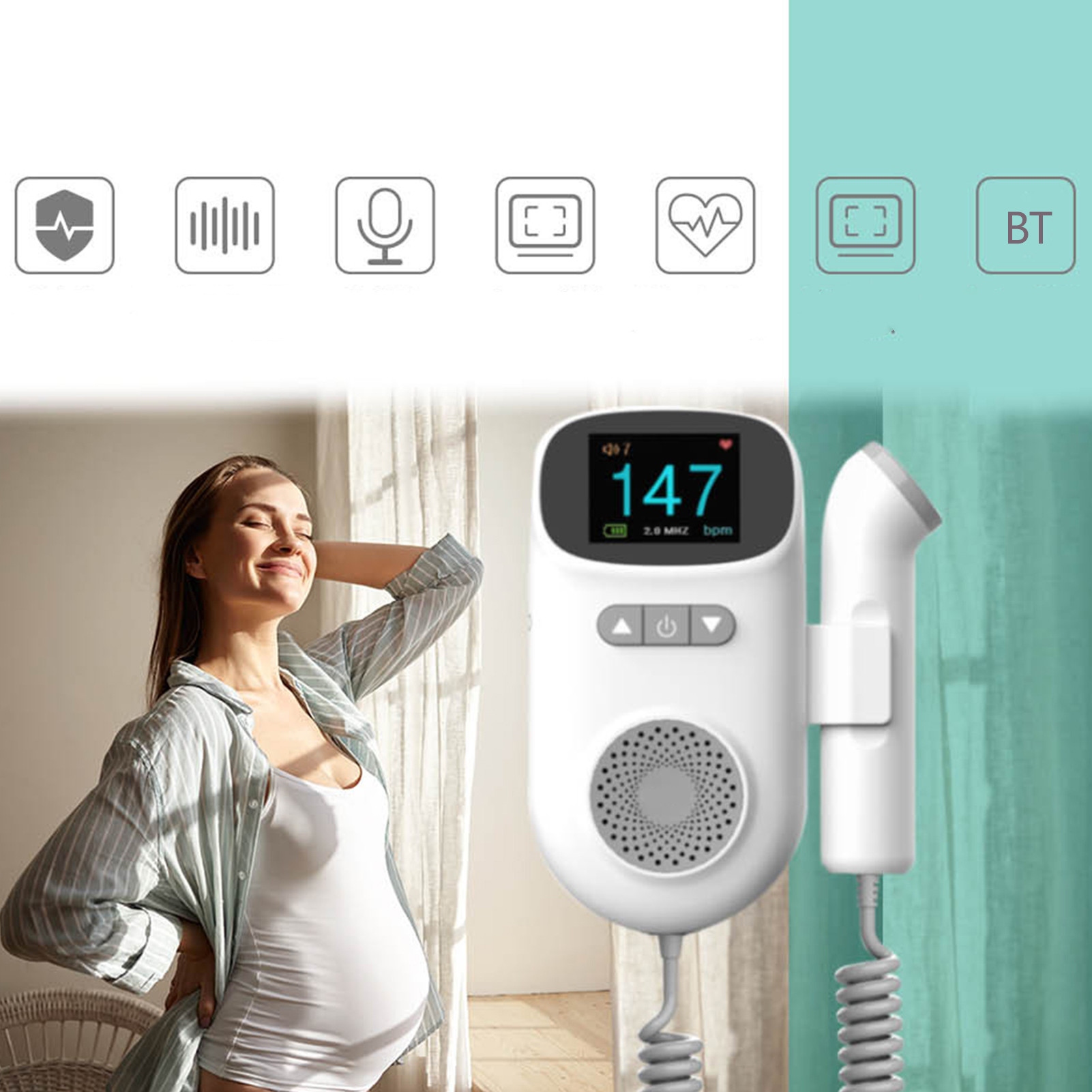 Фетальный допплер безопасен и надежен для беременных, имеет ЖК-дисплей, очень чувствительный ультразвук, отображает ЧСС в виде волны, встроенный динамик и функцию BT.