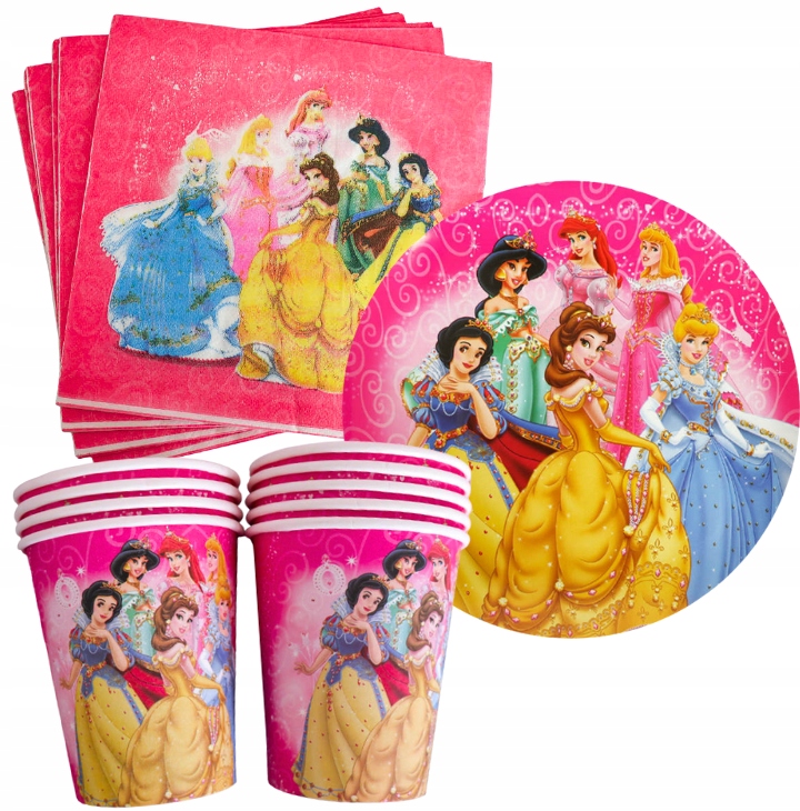 В комплект входят: салфетки 20 шт, тарелки 10 шт и стаканчики с мотивом принцессы Диснея.