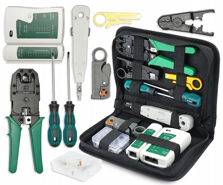 Полный комплект — в комплект входит кабельный тестер , щипцы, толкатель, вилки RJ 45, инструмент для зачистки, плоская и крестовая отвертки и инструменты для резки кабеля. Все это позволяет устранить любые неисправности и является обязательным для каждого установщика сети.