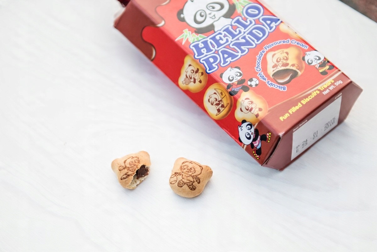 Hello Panda - это не фальшивый Hello Kita, один из самых популярных тортов в Японии! Они производятся Мэйдзи Сейк с 1979 года. Можно сказать о них, что они сделаны с действительно японской точностью. Деликатные подушки скрывают вкусную начинку. Кроме того, каждый из них носит изображение панды, занимающейся различными видами спорта. Это единственные панды, которые у вас не будет раскаяния после еды;)