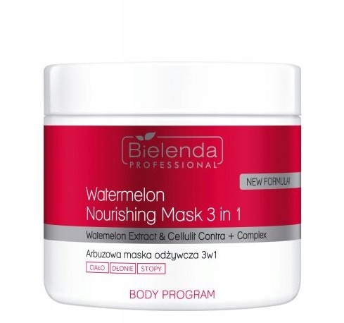 Пищевая маска для арбузы 3 в 1 из профессиональной серии Bielenda, сочное искушение, предназначенное для ухода за телом, рук и ног. Содержит экстракт арбуза, увлажняющий и размягчающий кожу, комплекс Cellulite Contra+, стимулирующая микроциркуляцию и диету, которая регенерирует, питает и успокаивает раздражения