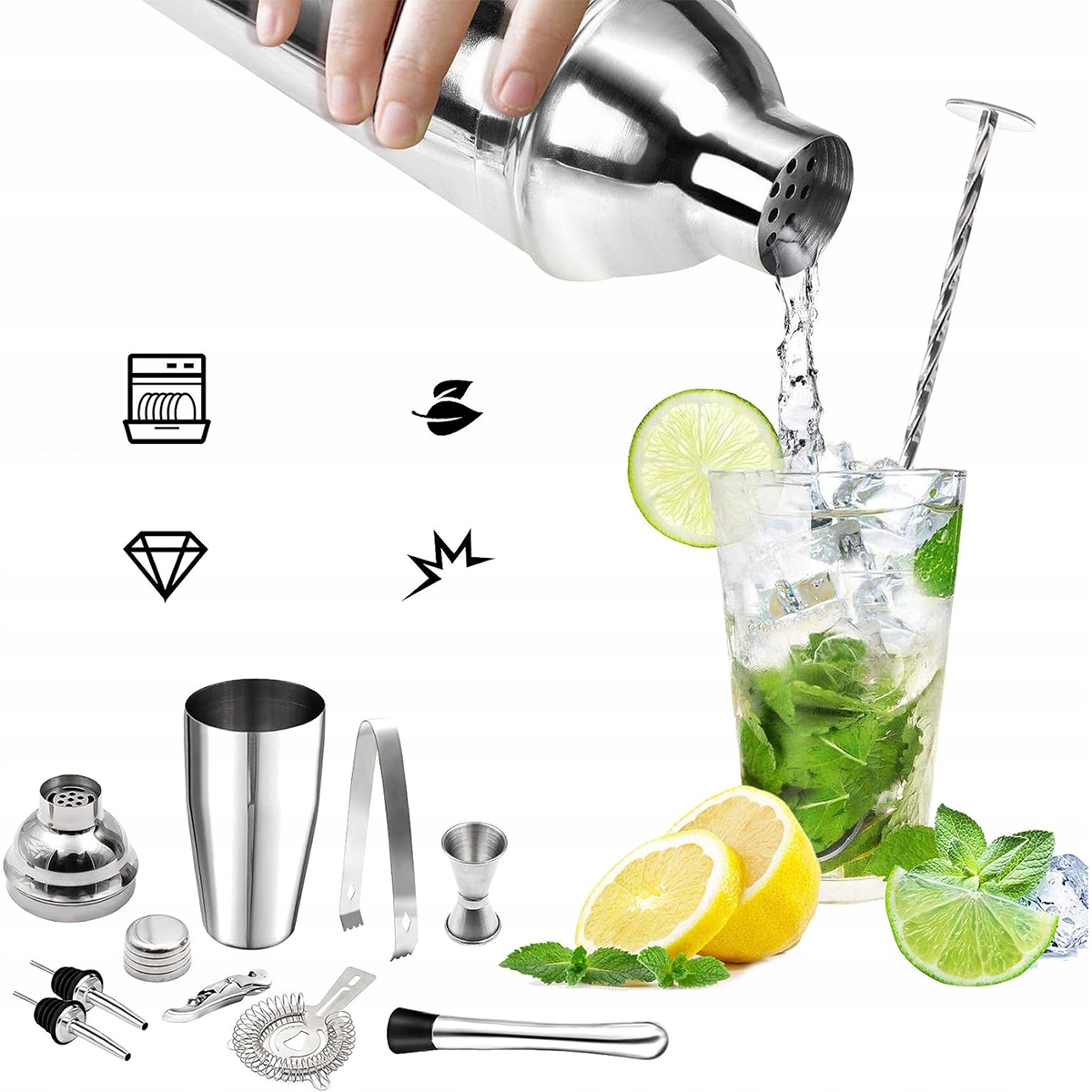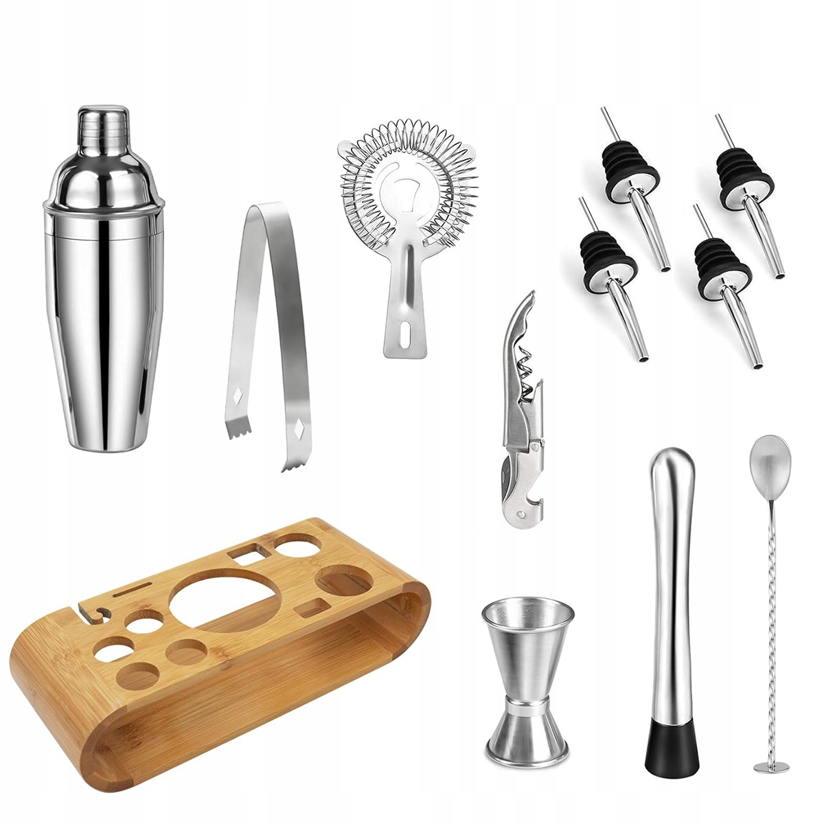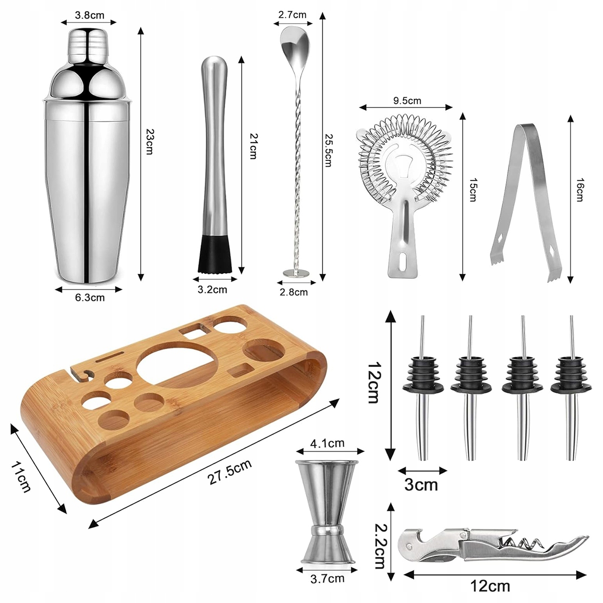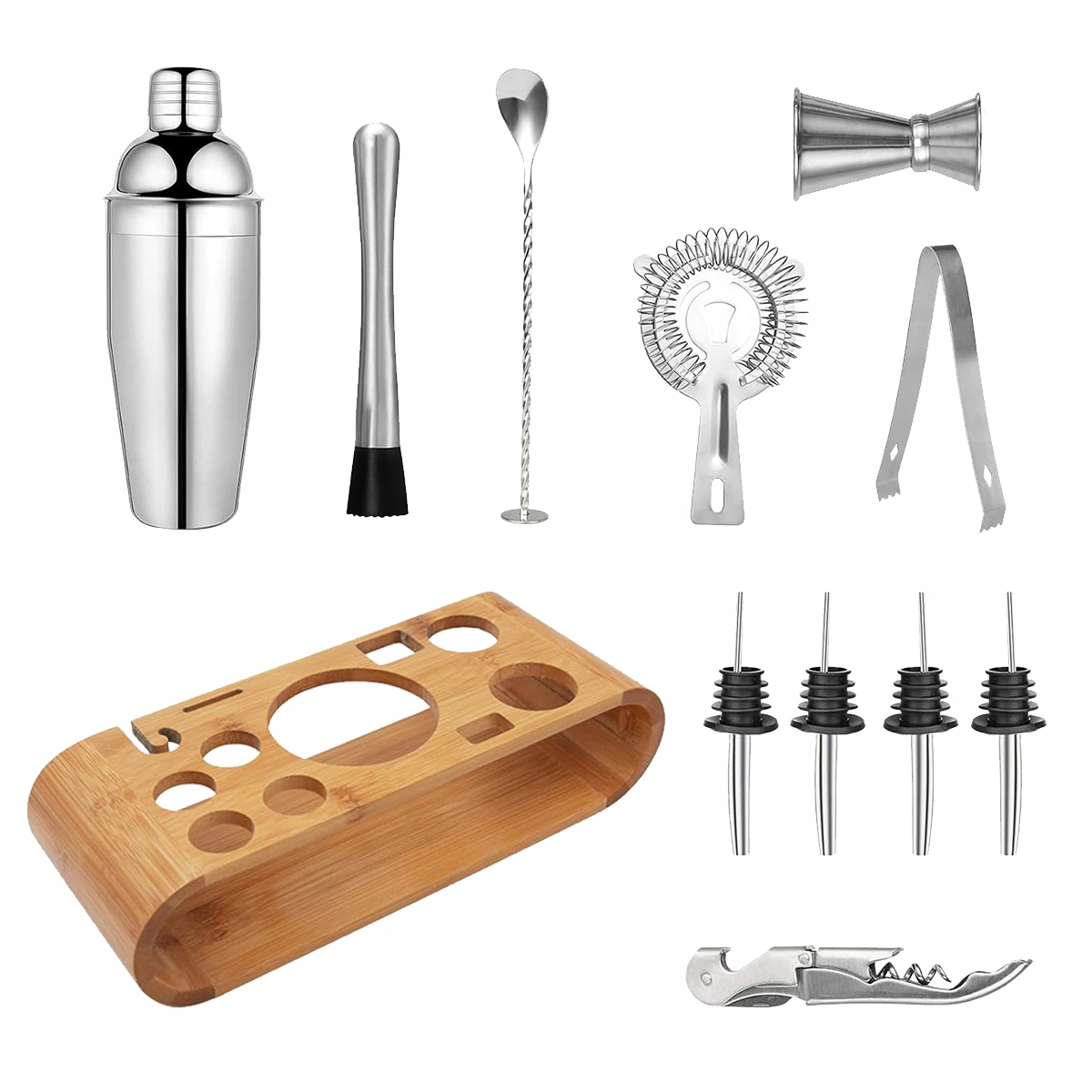 - Полный набор для бармена: содержит до 12 аксессуаров, в том числе шейкер на 750 мл, мадлер, разливщики, щипцы для льда, барменское ситечко, барная ложка и многое другое.