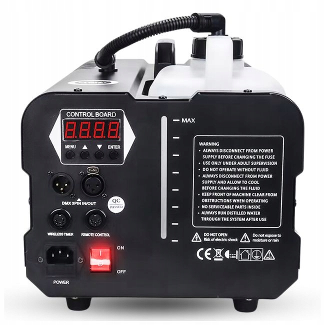 Light4me Pro Fog 2500W оснащен четким дисплеем с 4 кнопками, благодаря которому мы можем легко поддерживать меню устройства. С помощью его помощи мы можем установить параметры плотности и временного времени, такие как интервал между нарядами дыма или время непрерывного излучения. Генератор также может быть подключен к контроллеру DMX и с помощью его помощи регулировать интенсивность испускаемого дыма. Дополнительное облегчение - это объемная скорость жидкости, благодаря которой мы можем легко увидеть, когда жидкость должна быть добавлена в генератор.